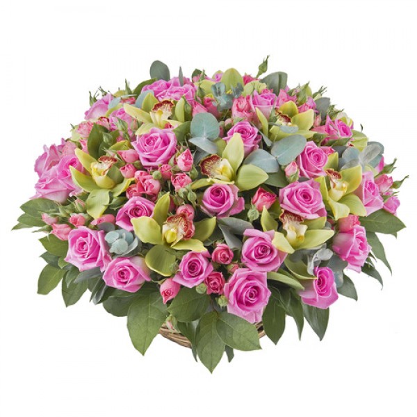 Букет в корзине цветы 101 шт. Композиция Корзина Королевских орхидей, роз и Эквалипта 40 см. (Эквадор)