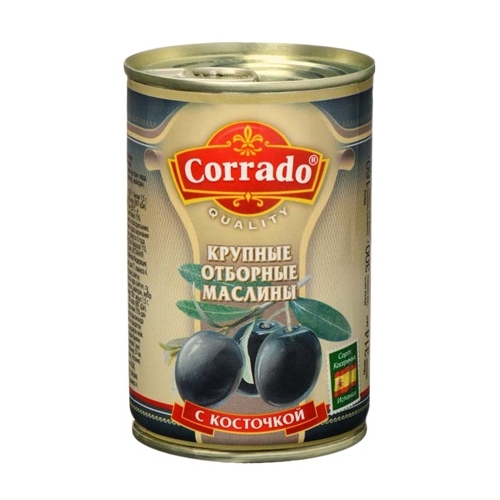 Corrado Маслины крупные отборные с косточкой в рассоле, жестяная банка 300 г