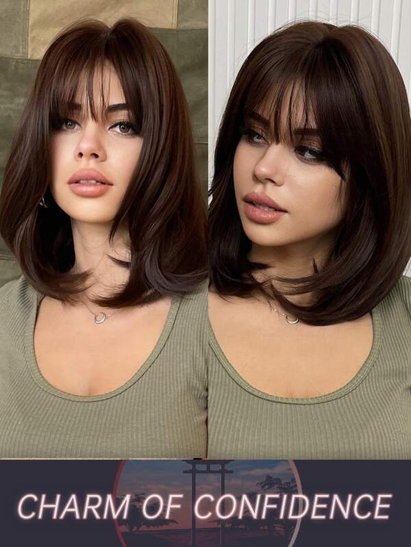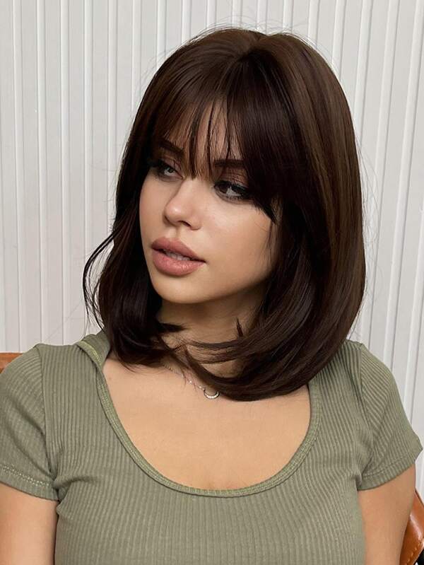 Короткий женский парик, коричневый синтетический многослойный парик с челкой