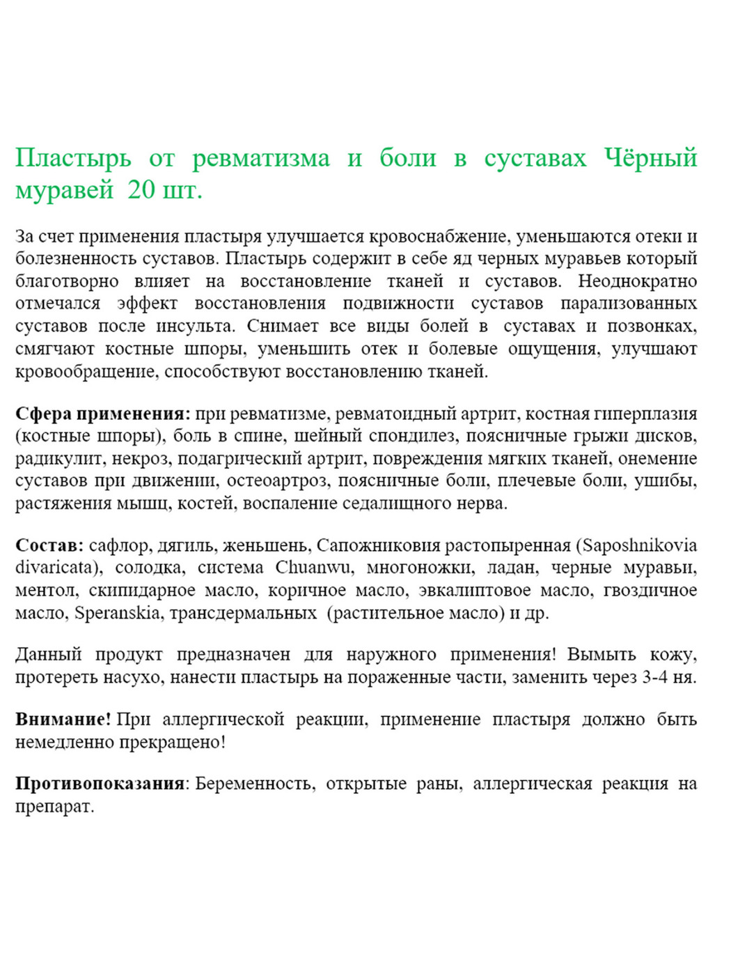 Пластырь обезболивающий Пластырь от ревматизма и боли в суставах Черный муравей 20 шт.