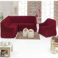 Натяжной чехол на угловой диван и чехол на кресло (вишневый)