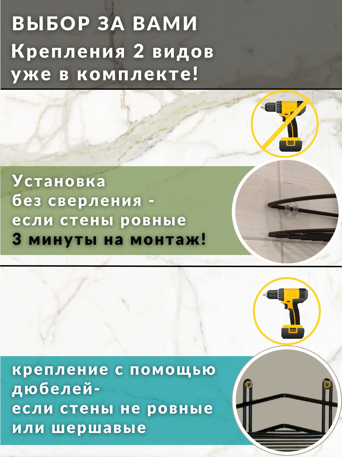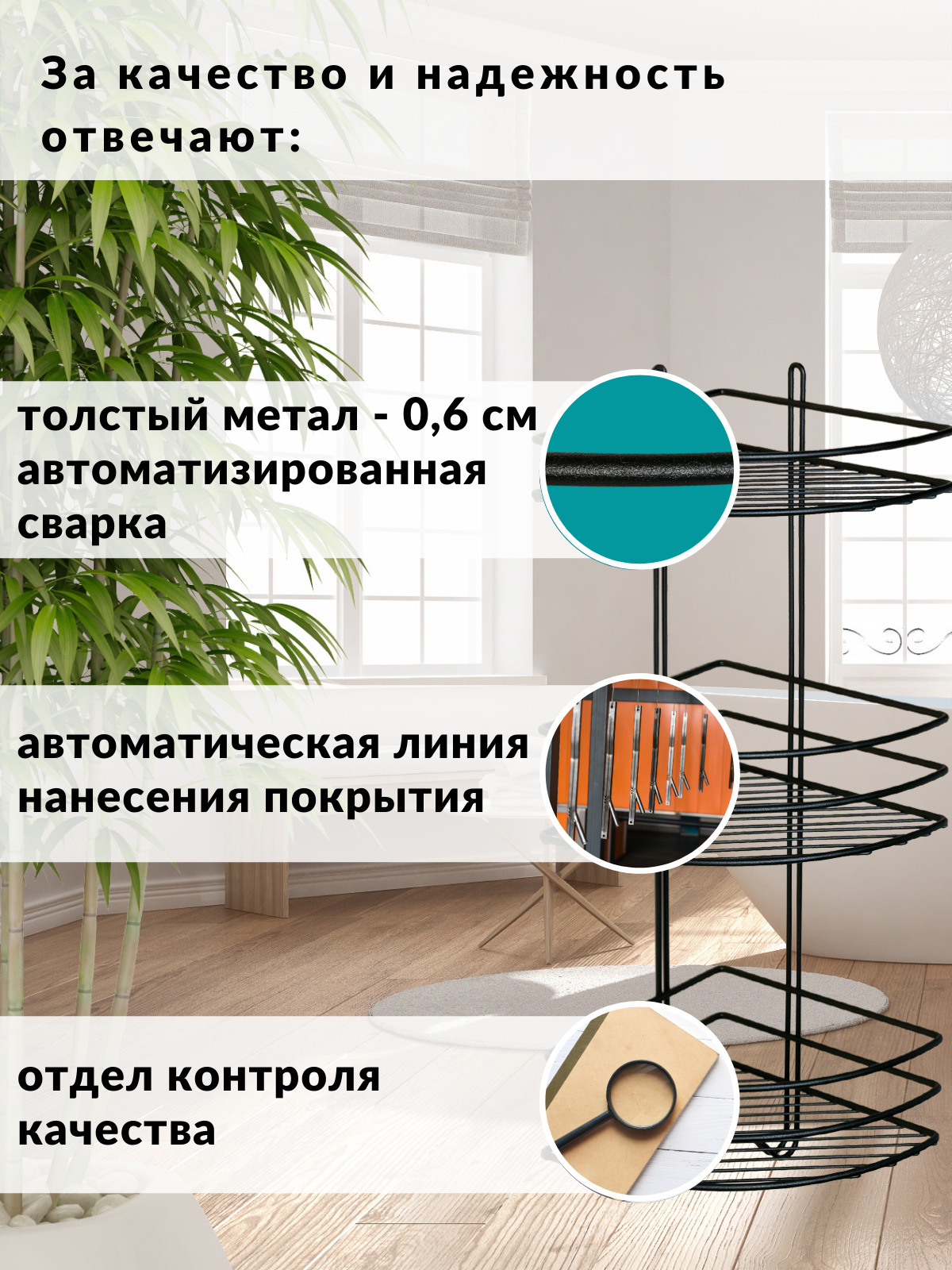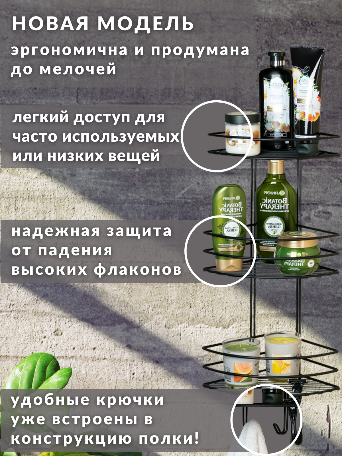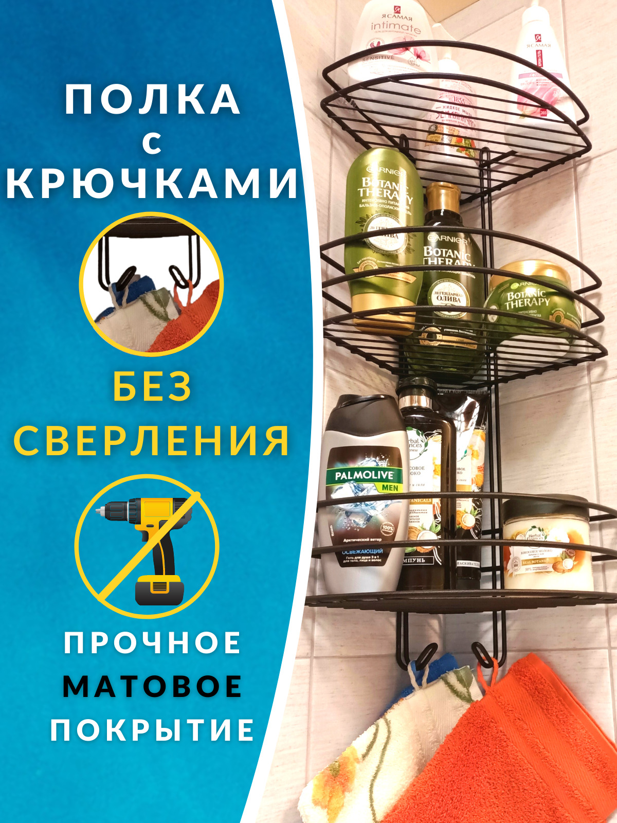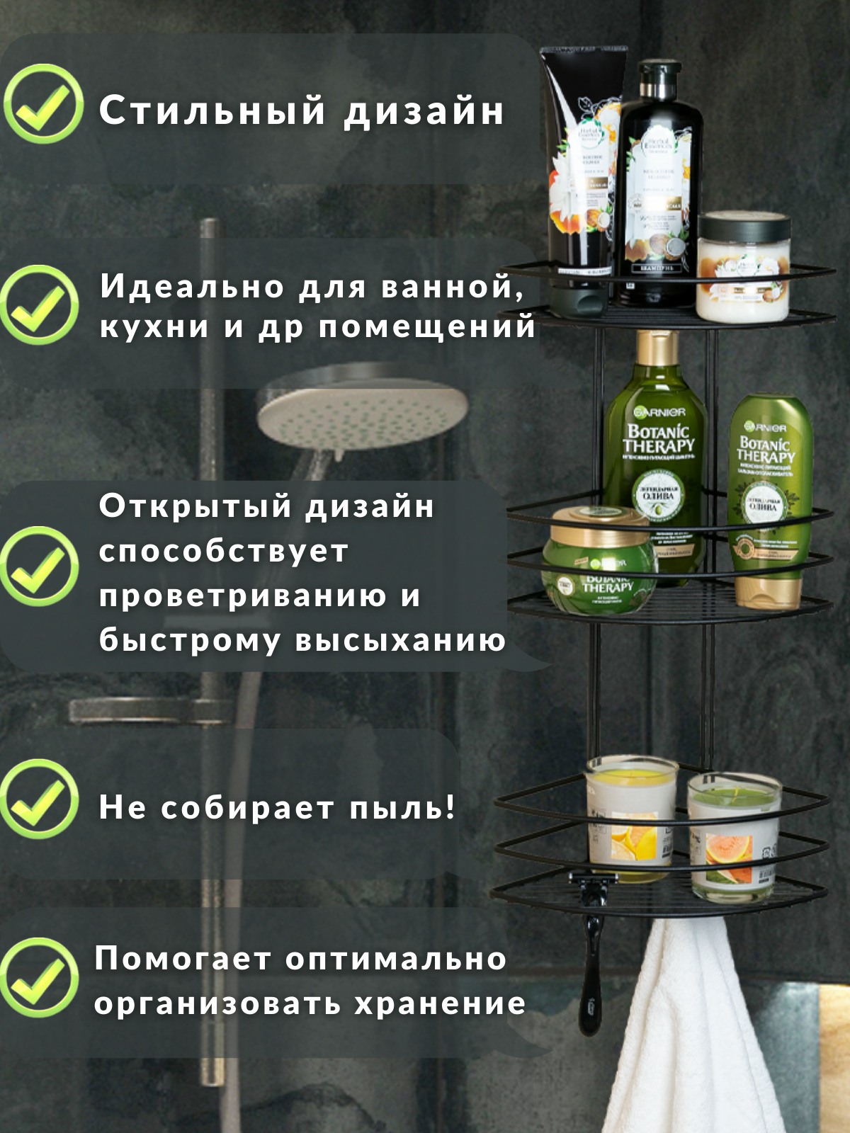 Полка для ванной угловая настенная 3-х ярусная металлическая с крючками черный