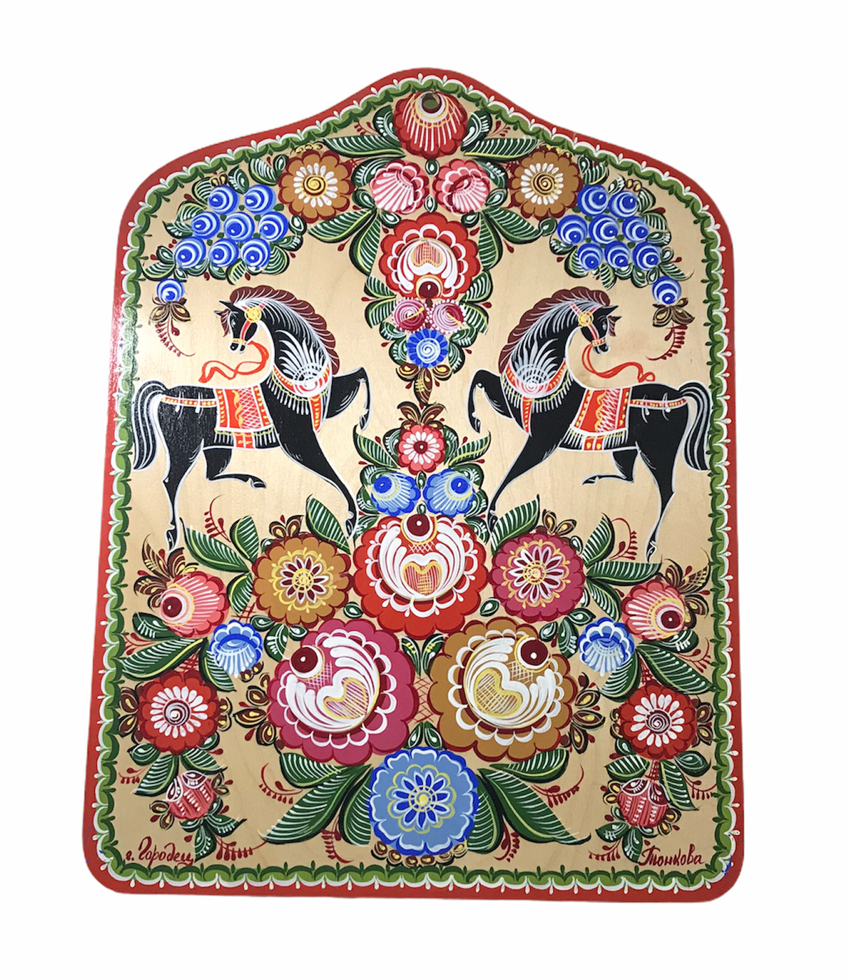 Доска расписная "Лошадки", городецкая роспись, дерево, ручная работа, 56х42 см.