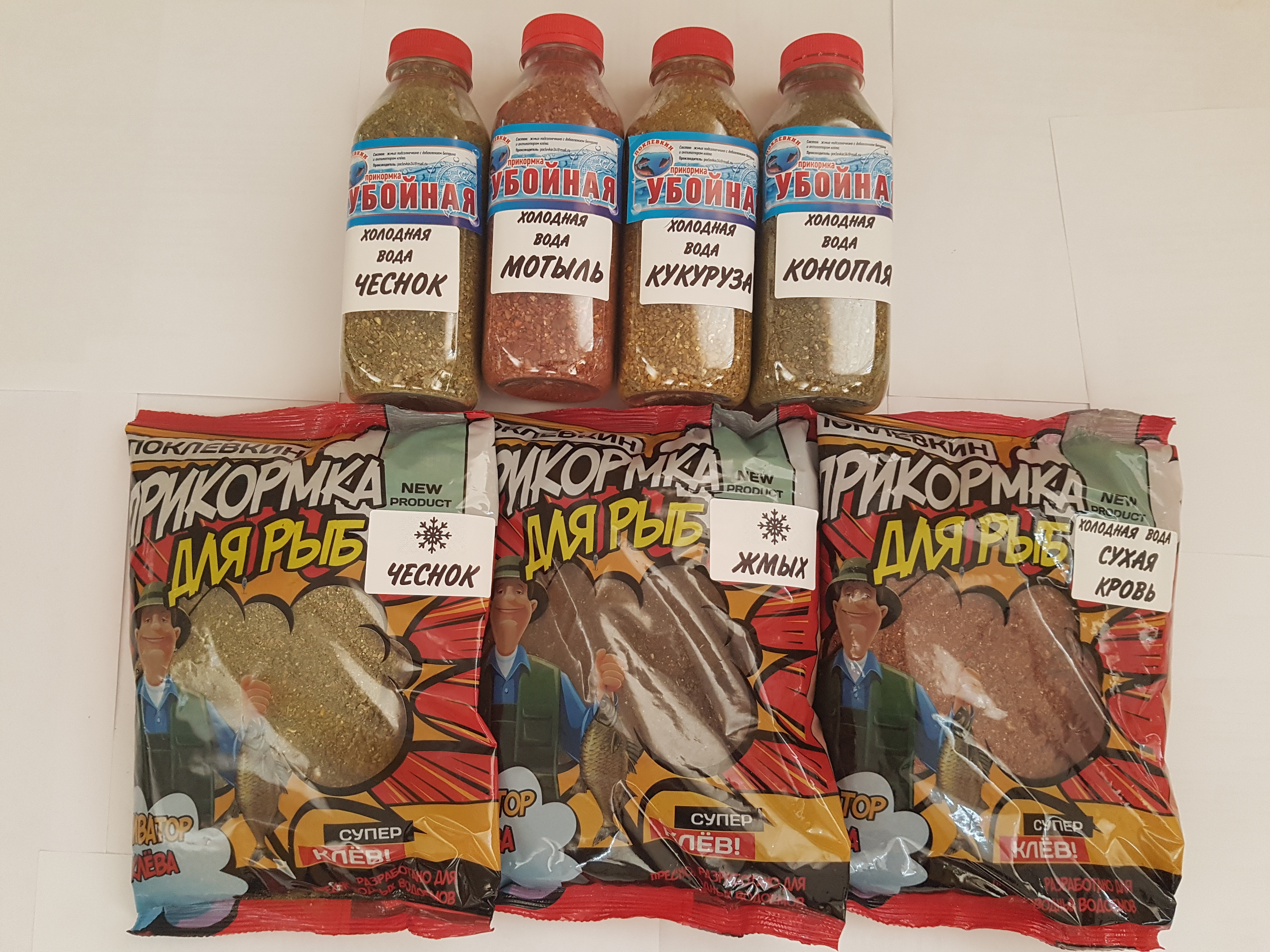 ЗИМНИЙ НАБОР ПРИКОРМКИ Поклевкин 4 бутылки по 1л (чеснок, мотыль, сухая кровь, конопля)