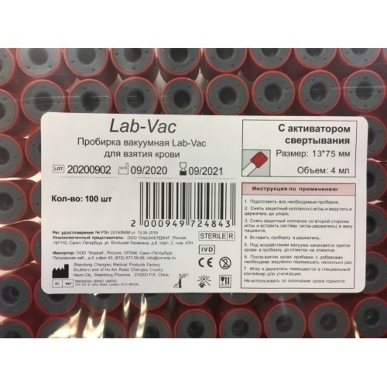 Пробирки вакуумные Lab-Vac с активатором свертывания 13х75 4 мл -100 штук