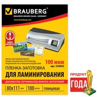Пленки-заготовки для ламинирования BRAUBERG, комплект 100 шт., 80х111 мм, 100 мкм, 530902