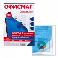 Обложки для переплета офисмаг, комплект 100 шт., А4, пластик 150 мкм, прозрачно-синие, 531447