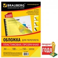 Обложки для переплета Brauberg 530938, комплект 100 шт., А4, пластик 150 мкм, прозрачно-желтые