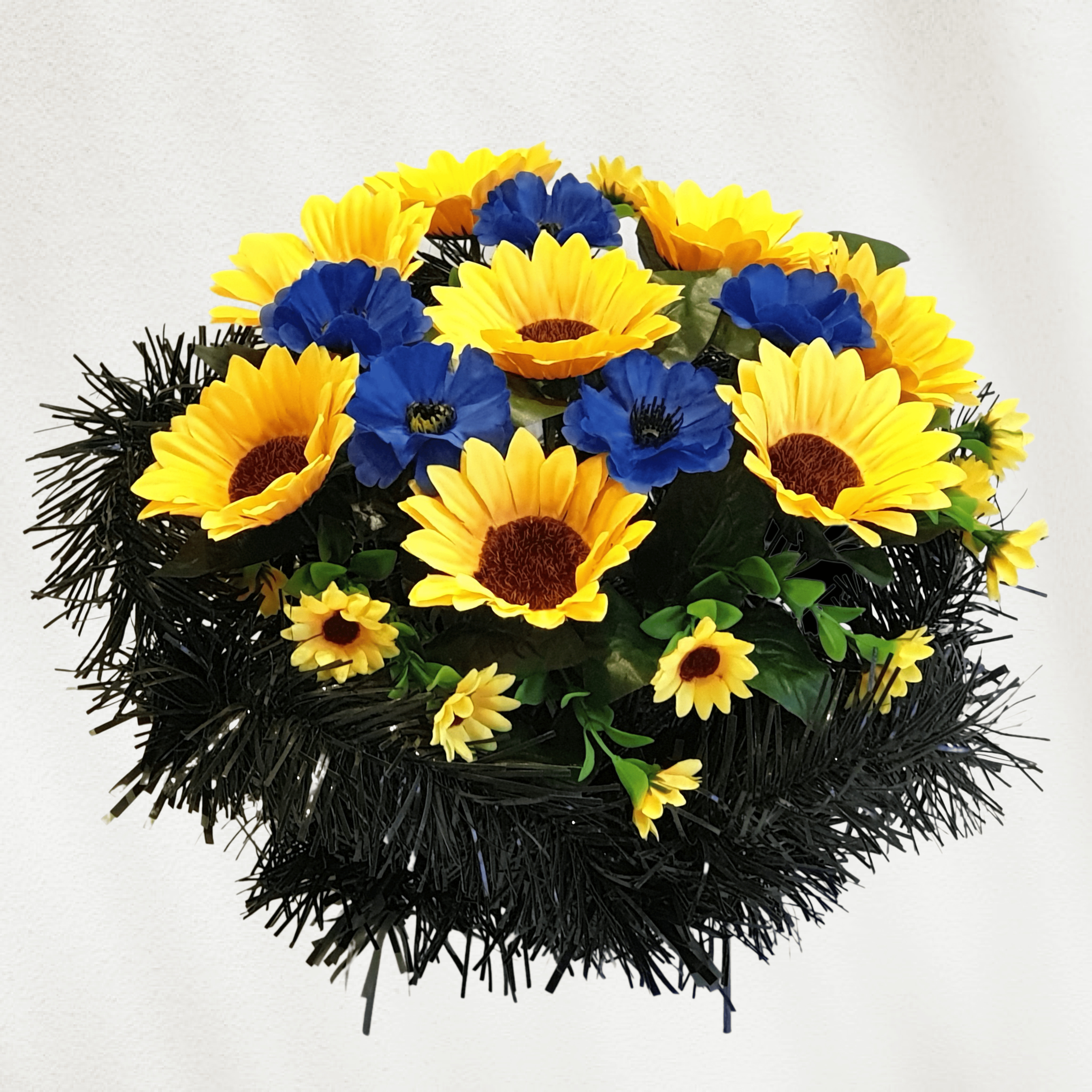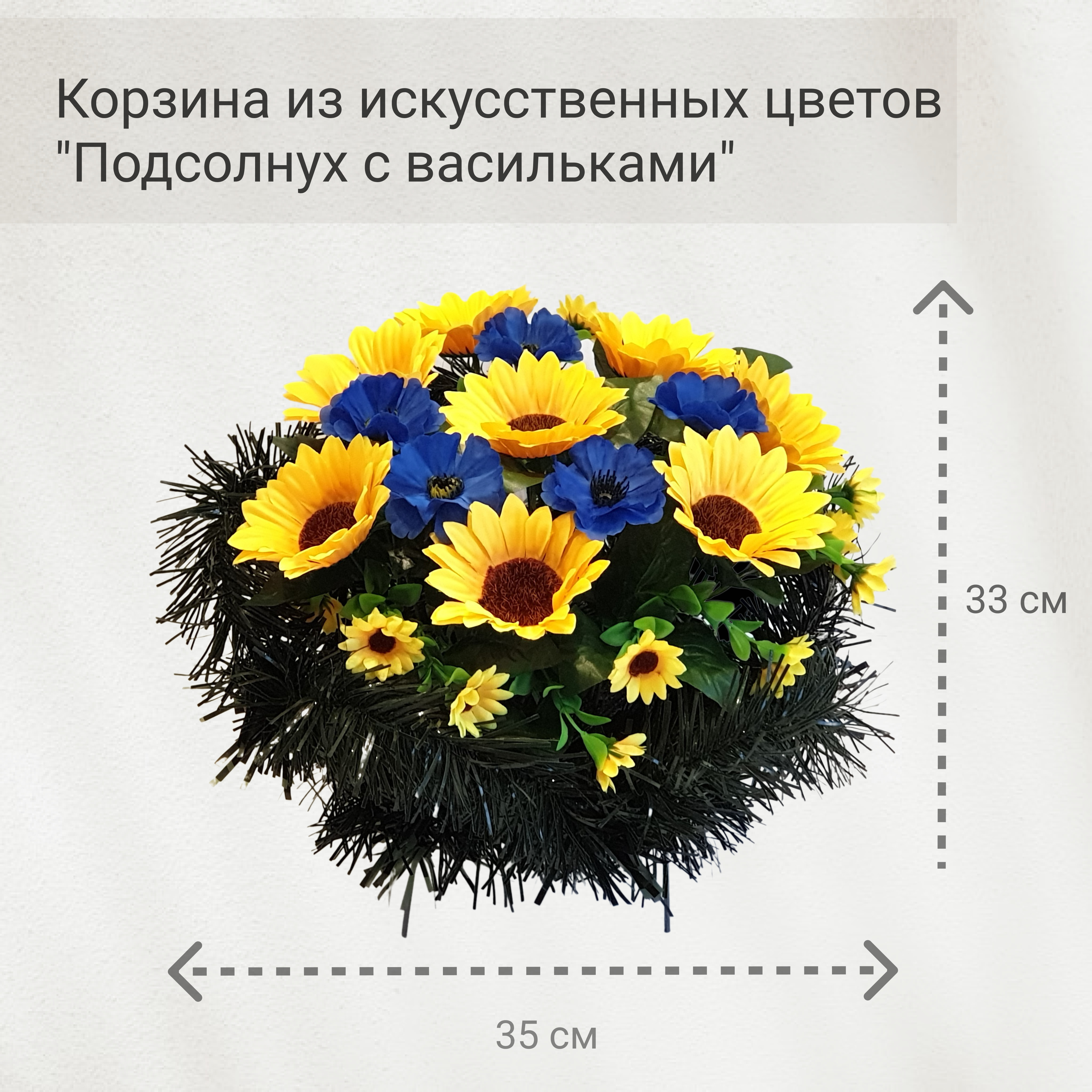 Корзина ритуальная из искусcтвенных цветов "Подсолнух с васильками" / Ритуальные цветы/ Цветы искусственные на кладбище