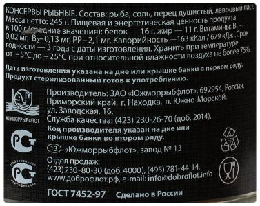 Сельдь тихоокеанская "Доброфлот" натуральная, 245г