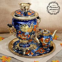 Набор «Птица на синем», жёлудь, 3 предмета, самовар 3 л, заварочный чайник 0,7 л, поднос