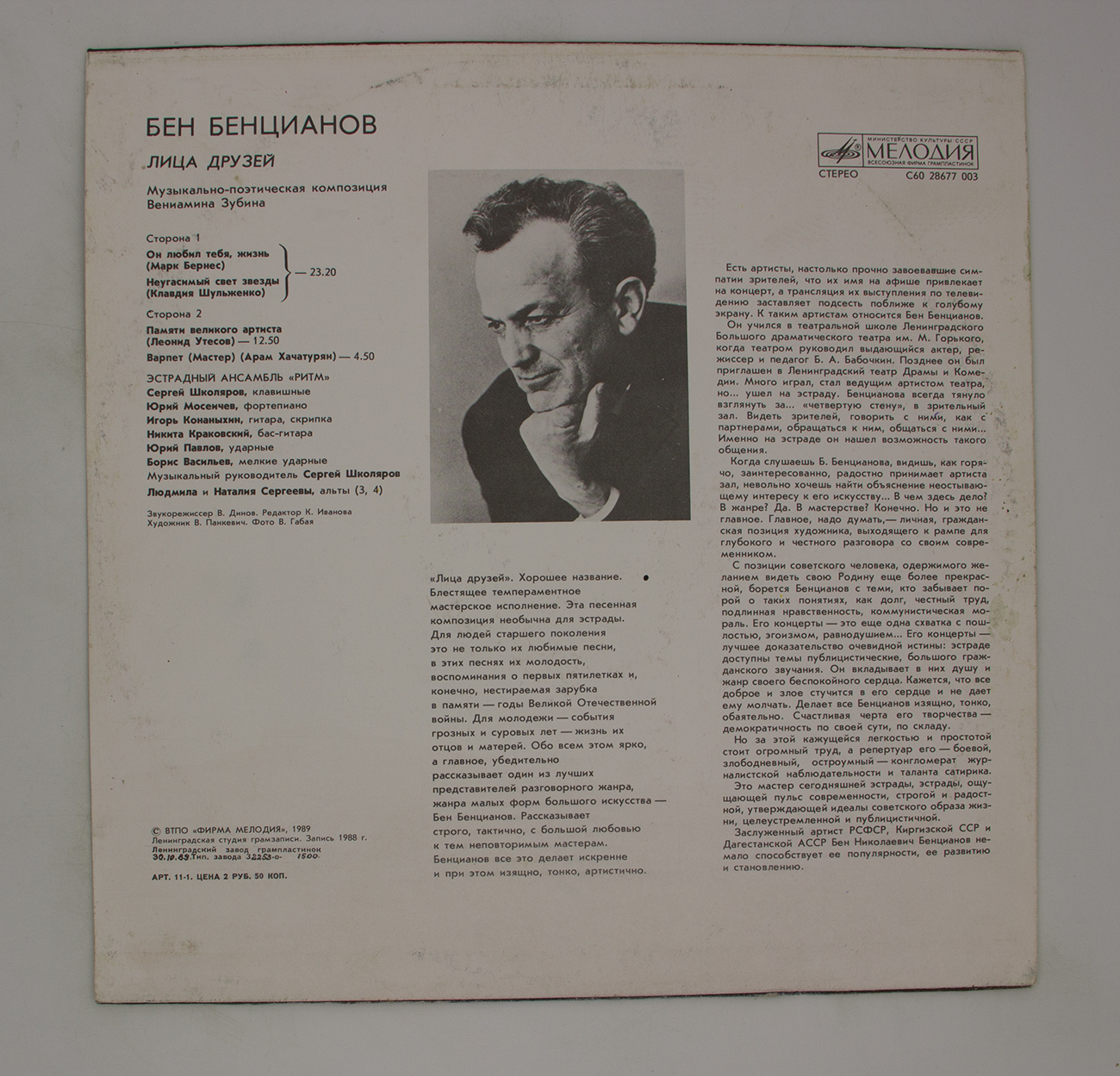 Виниловая пластинка Бен Бенцианов - Лица друзей, - LP