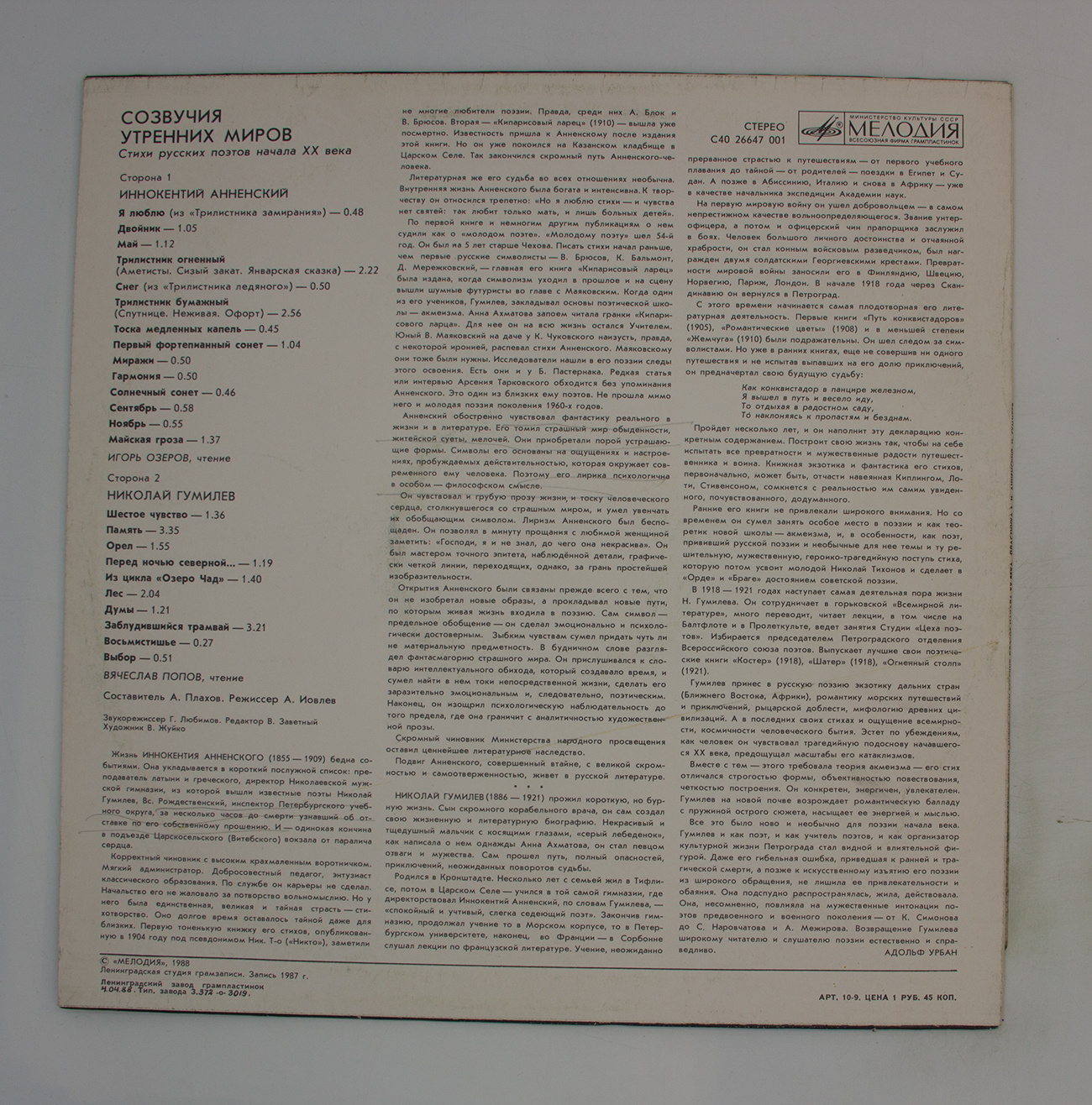 Виниловая пластинка И. Анненский Н. Гумилев - Созвучия утренних миров, - LP