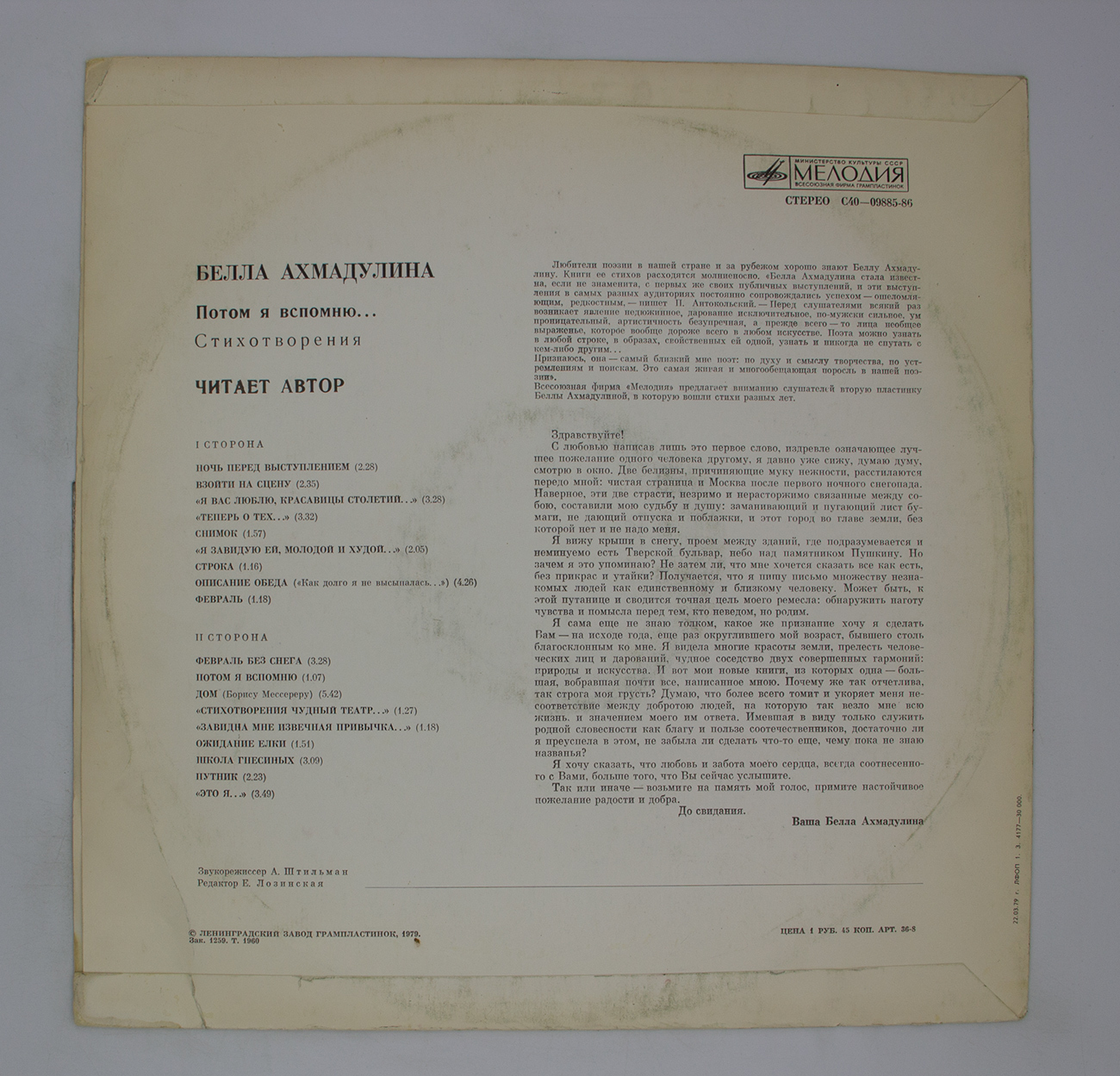 Виниловая пластинка Белла Ахмадулина - Потом я вспомню... LP