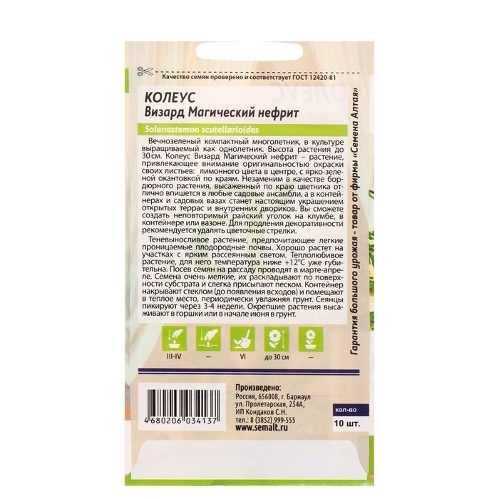 Семена комнатных цветов Колеус "Визард" Магический Нефрит, Мн, цп, 10 шт.