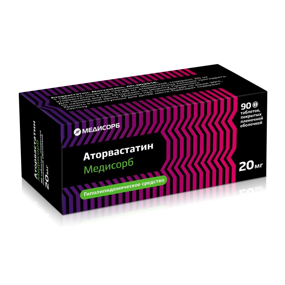 Аторвастатин медисорб 20 мг 90 шт. блистер таблетки, покрытые пленочной оболочкой