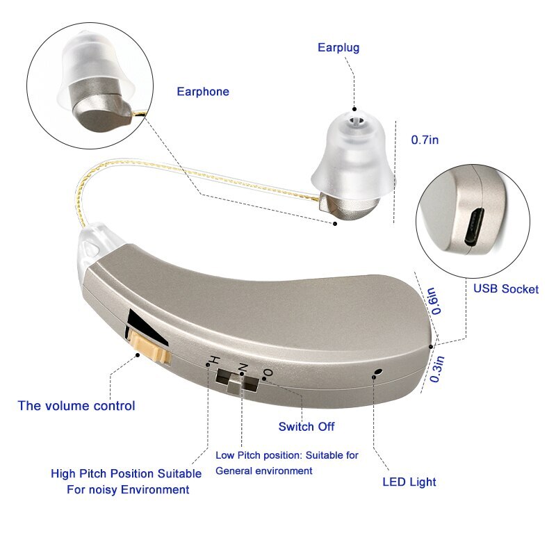 Перезаряжаемый слуховой аппарат с шумоподавлением и подавлением обратной связи (левое и правое ухо)