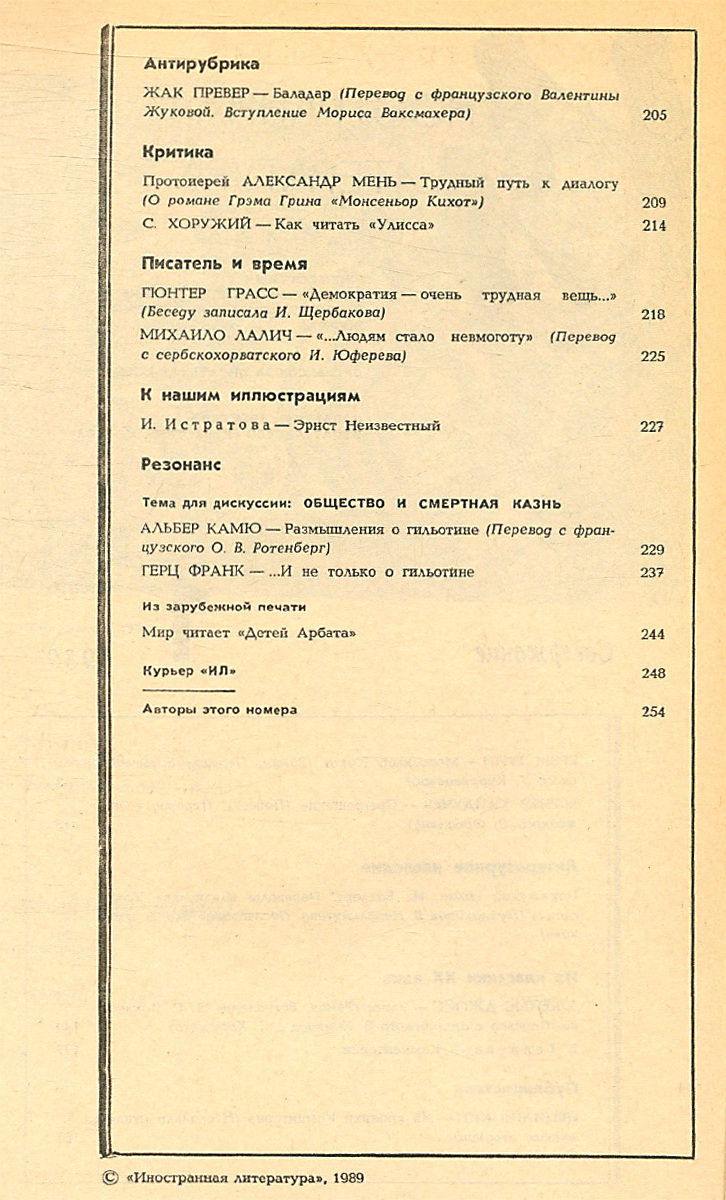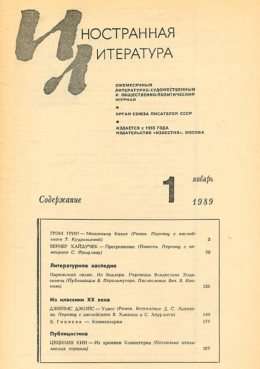 Журнал "Иностранная литература". Выпуск 1, 1989 год