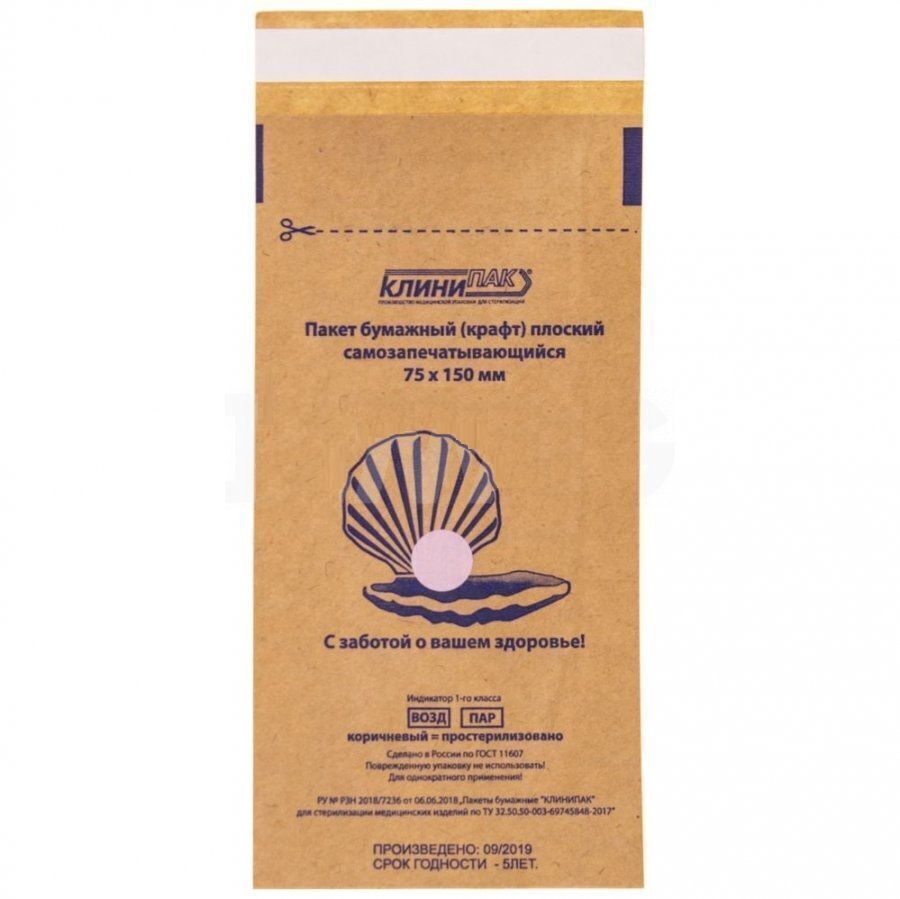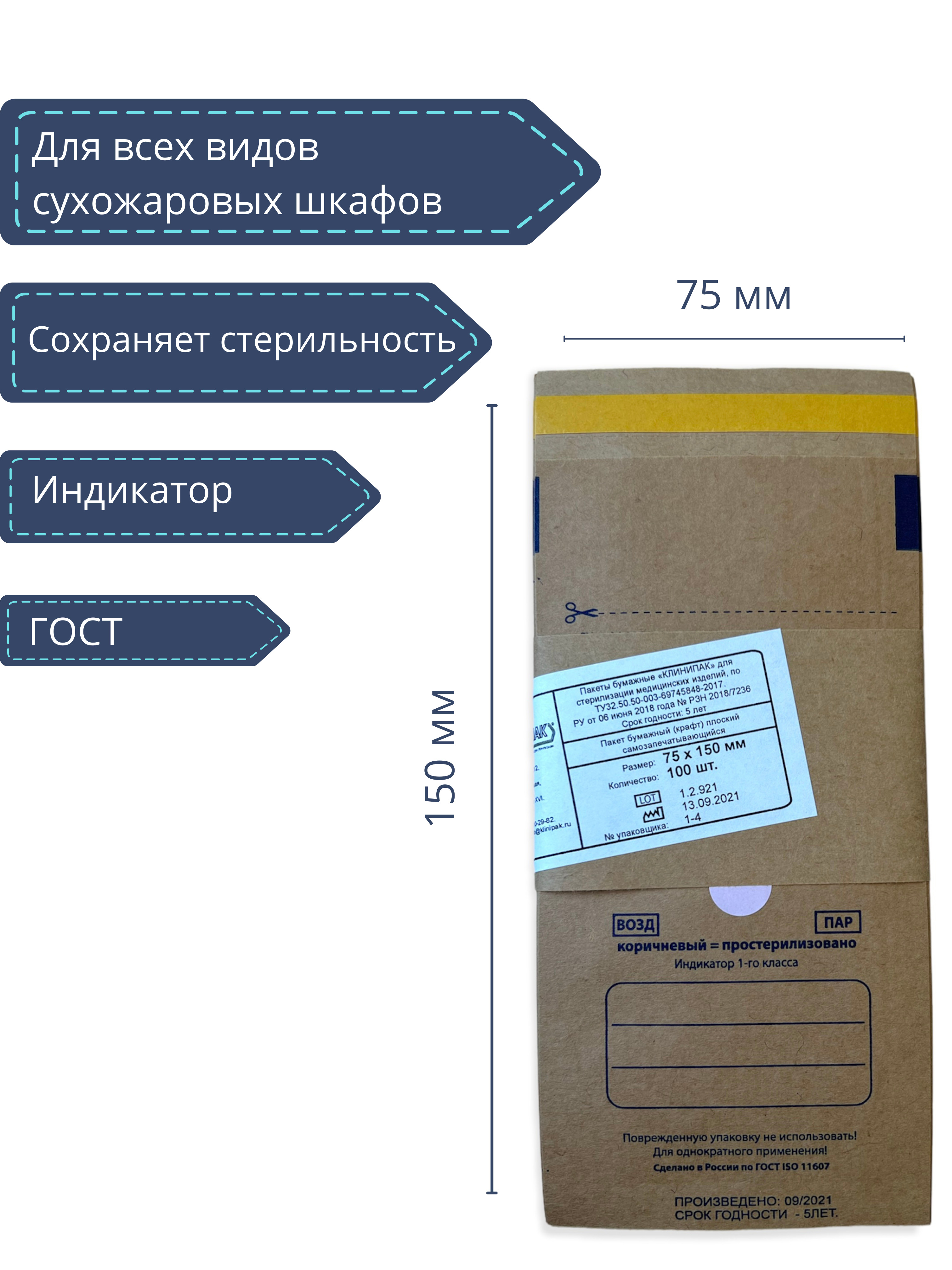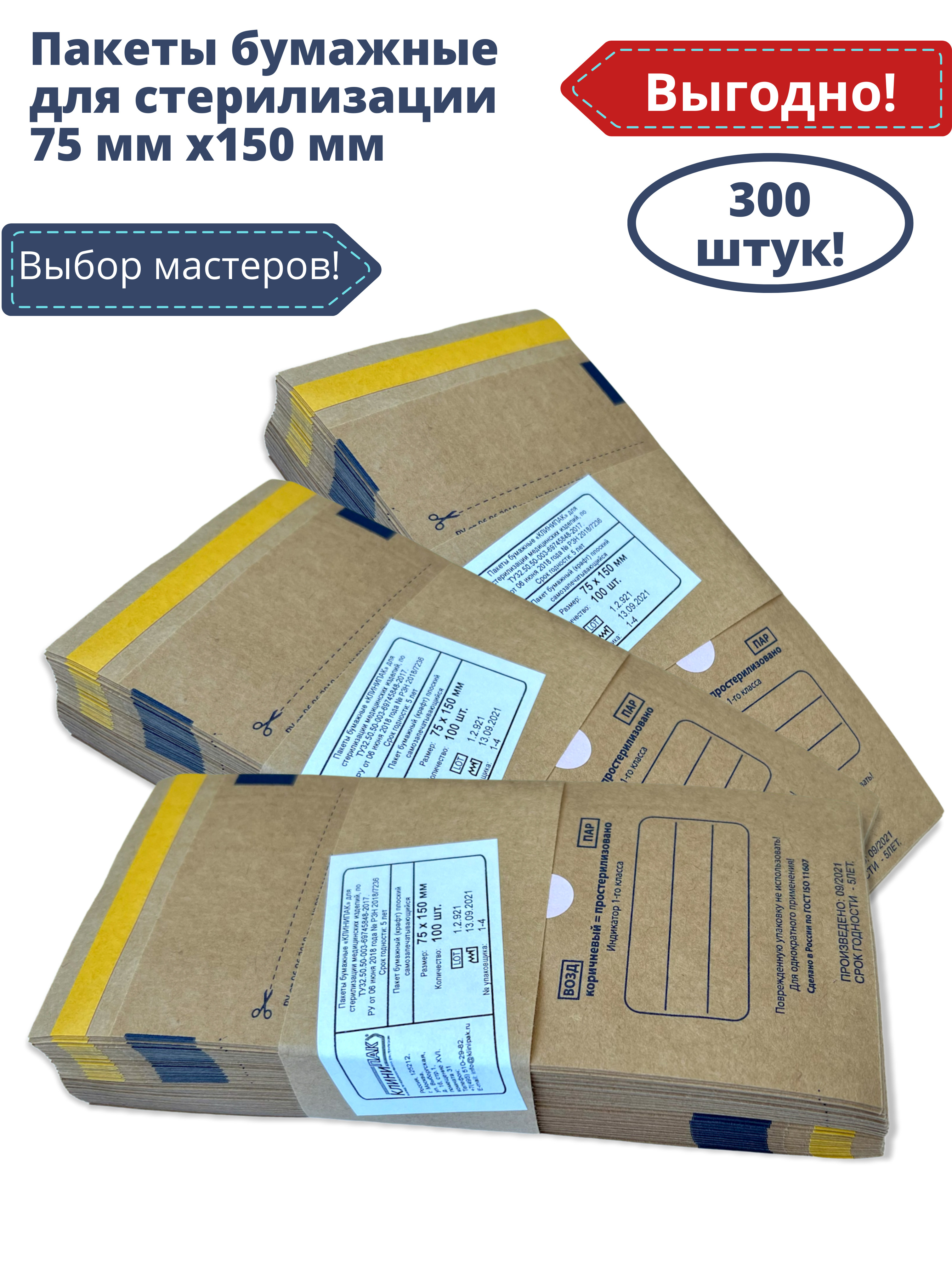 Крафт пакеты 75х150, 100шт коричневые для стерилизации инструментов, комплект 300 шт