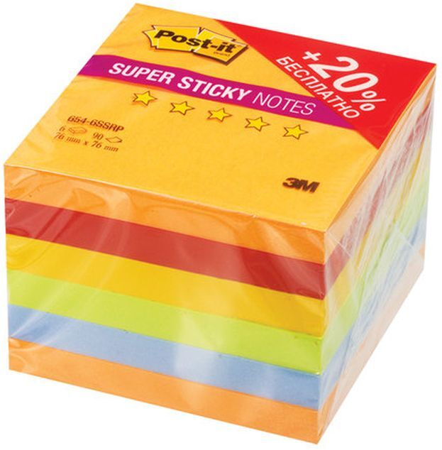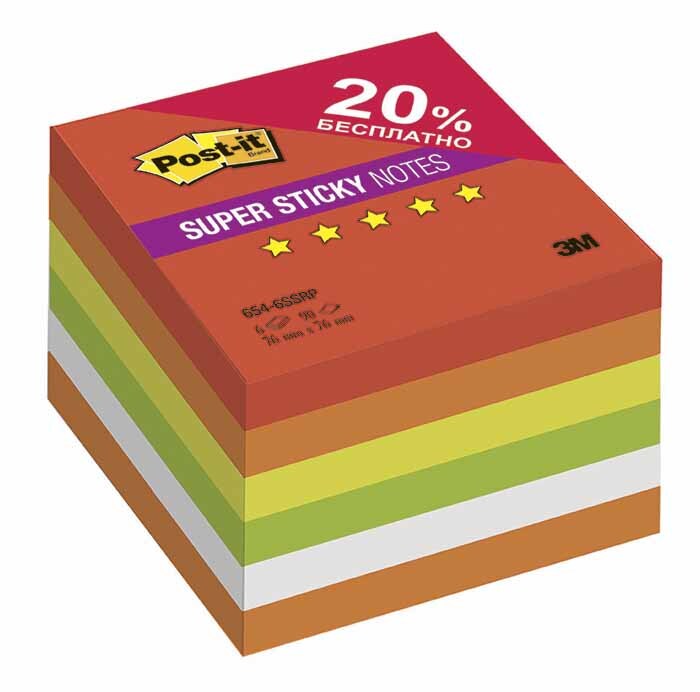 Набор суперклейких стикеров Post-it Огонь Плюс, 5 цветов, 76 х 76 мм, 6 блоков по 90 листов