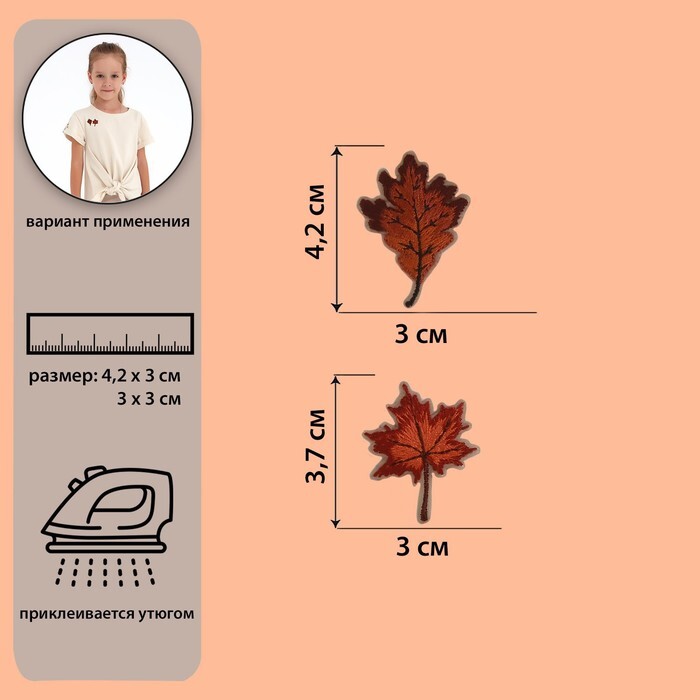 Наклейка декоративная/Термоаппликация Листья, 3 х 4,2, 3 х 3,7 см, 2 шт 1 уп.