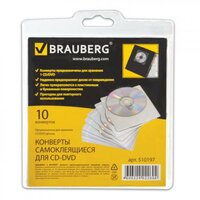Конверт для CD/DVD BRAUBERG, 12*13 см, 10 шт, прозрачный/белый 510197