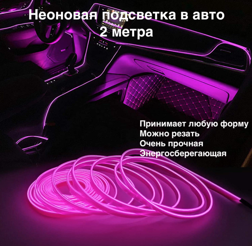 Неоновая нить для подсветки салона автомобиля, адаптер питания 12 В, 2 м, фиолетовый
