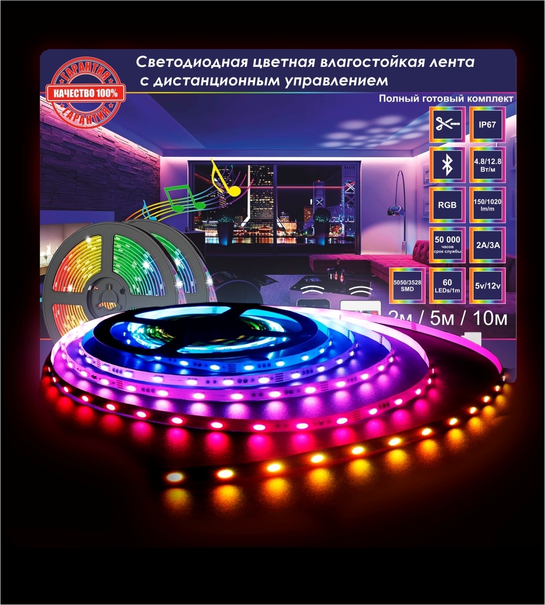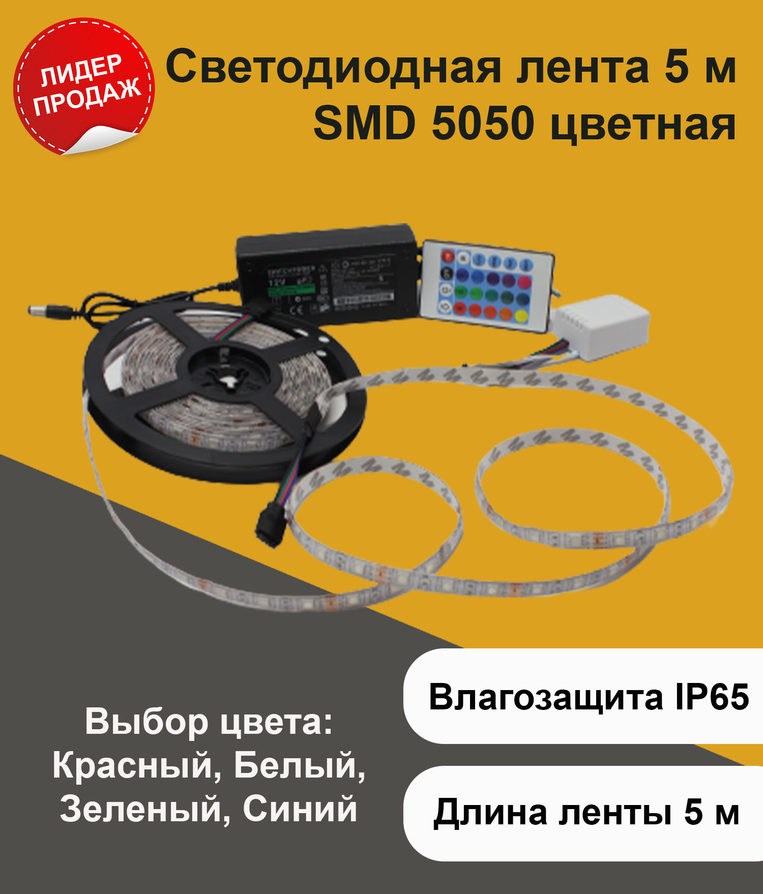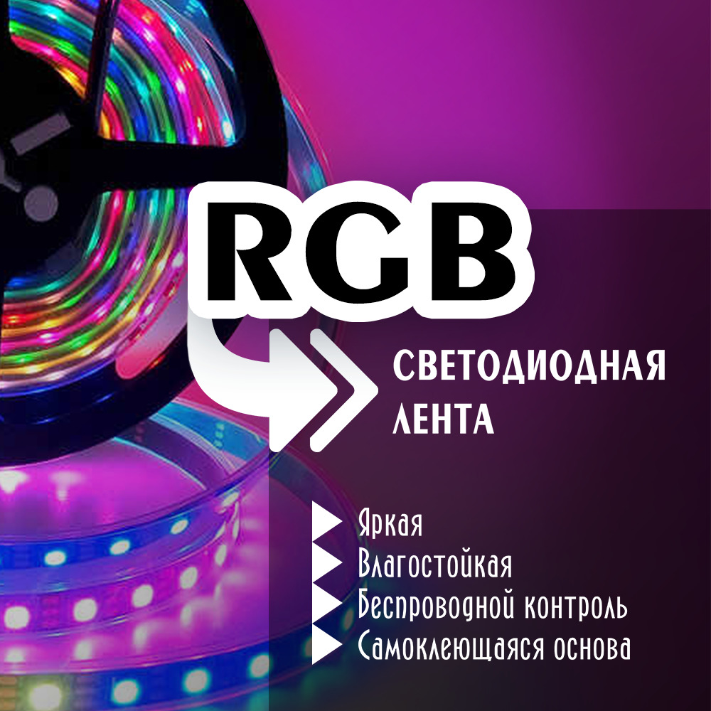 Светодиодная лента 5м, 12В, IP65 LED SMD 5050 Цветная