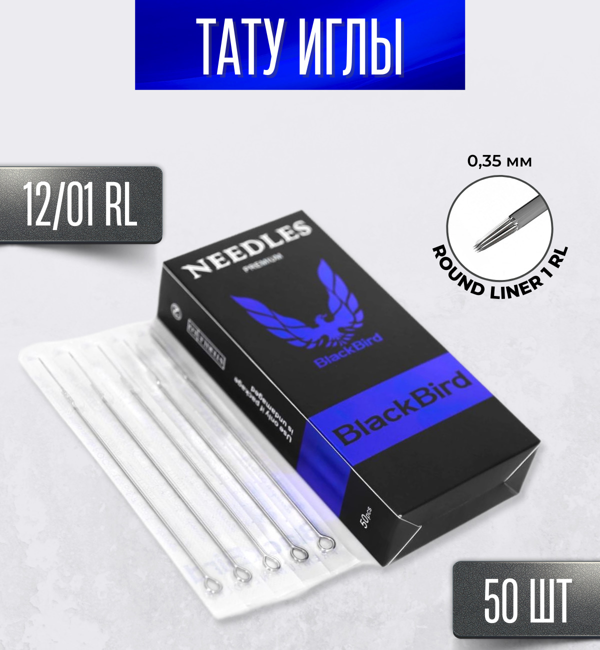 Тату иглы Blackbird 0.35 мм - Round Liner 35/03RL, 12/03RL, 3RL иглы стандартные для тату, перманентного макияжа, татуажа - 50 шт/уп