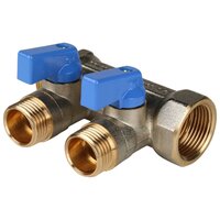Коллектор проходной запорный STOUT (SMB 6201 341202) 3/4" НР-ВР, 2 отвода 1/2" (синие ручки)