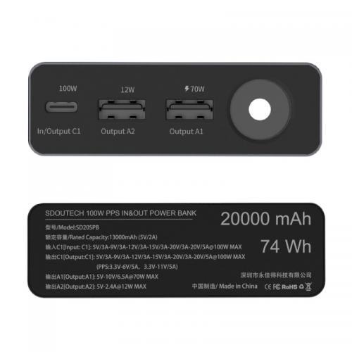 Sdoutech 20000 mAh 100W PD IN&OUT POWER BANK 2 USB-A + 1 USB-C SUPPORT SAMSUNG 25W&45W