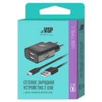 СЗУ адаптер 2 USB 2.1A + Дата-кабель Type-C 2А (100 см) черный, BoraSCO