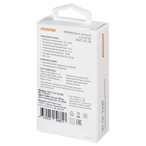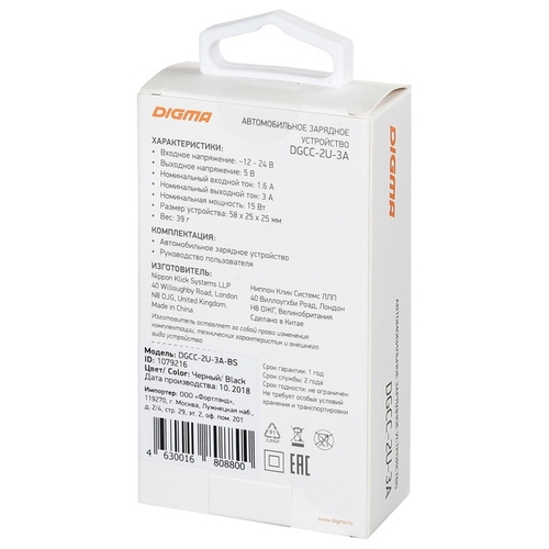 Автомобильная зарядка Digma DGCC-2U-3A