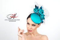 Вечерняя шляпка таблетка с вуалью и цветами "Яркая бирюза"