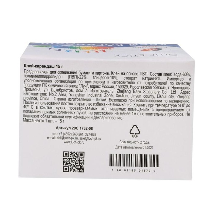 Клей-карандаш PVP 15 г Луч «Классика». Клей-карандаш - это твердый цилиндр клеевой массы, размещенный в пластиковом поворотном корпусе с колпачком. Предназначен для склеивания бумаги, картона, фотобумаги. Это идеальный помощник для работы и творчества.* К