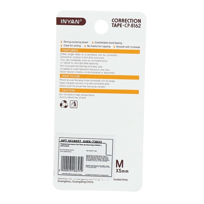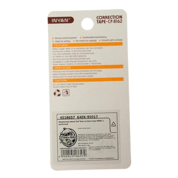 Корректор-лента 3м*5мм на блистере МИКС с рисунком. Вид: Корректирующая лента. Длина, м: 3. Европодвес: Да. Материал: Пластик. Размер упаковки: 6 см x 12 см x 2 см. Страна производителя: Китай. Ширина, мм: 5. ---.(4518657-2p-ours).В упаковке: 2 шт.