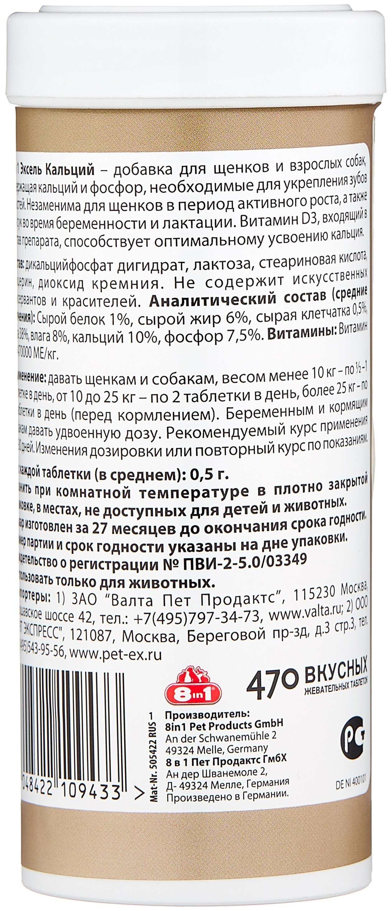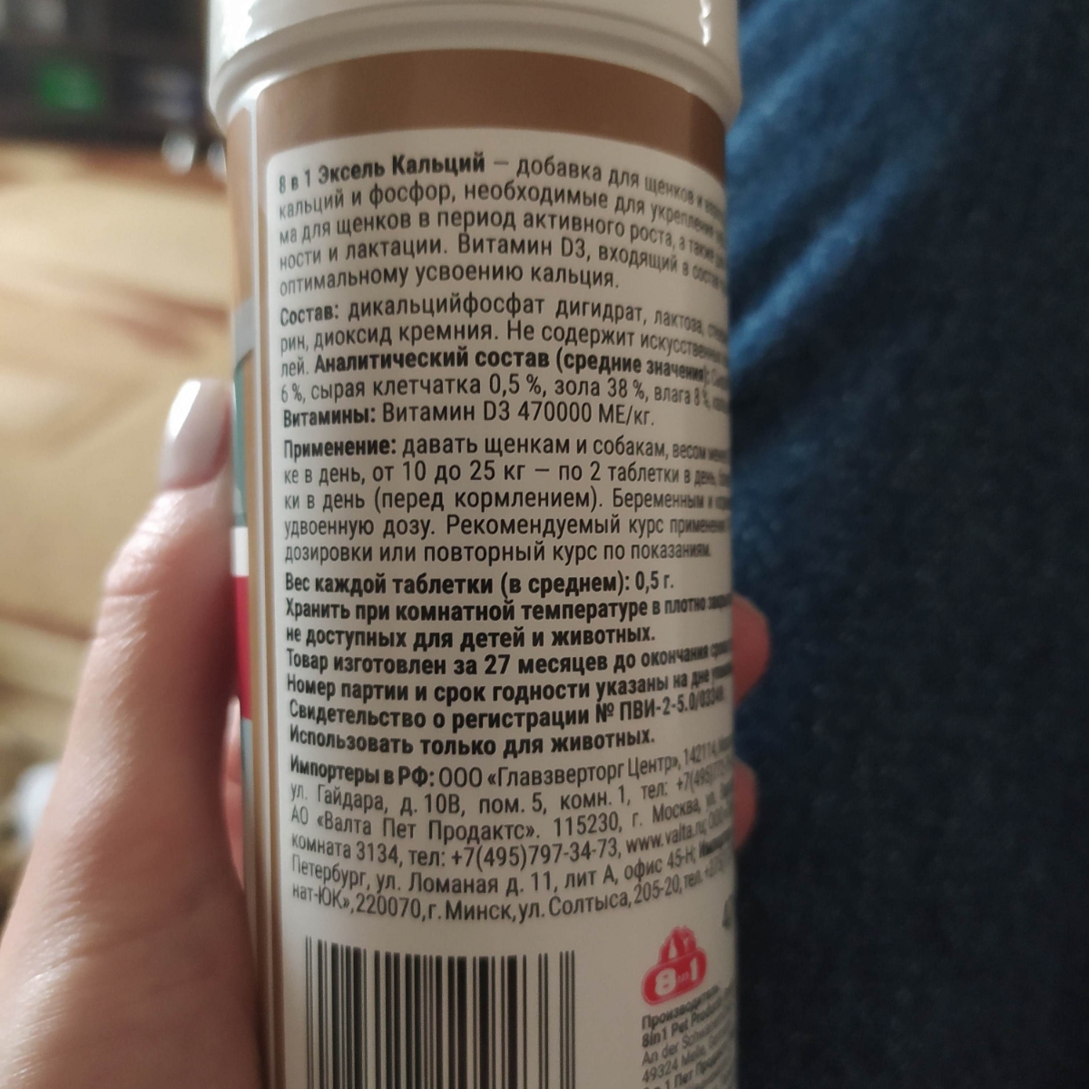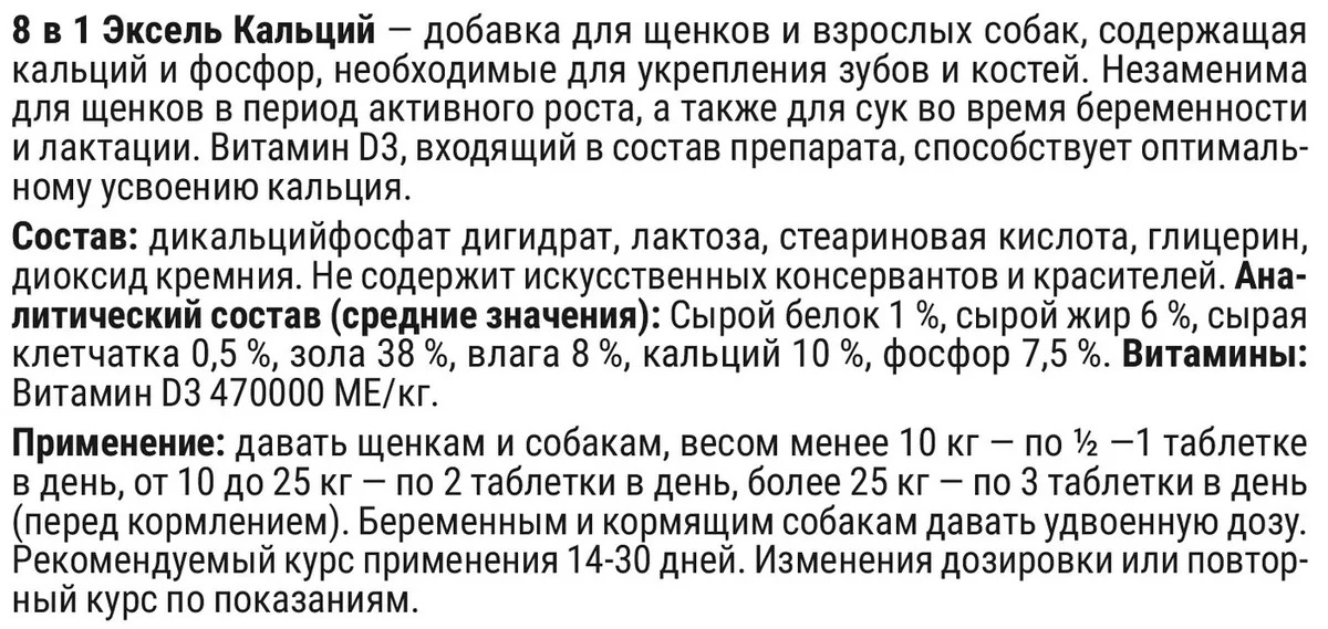 Состав:Дикальцийфосфат дигидрат, витамин D3, лактоза, стеариновая кислота, глицерин, диоксид кремния, натрия хлорид.Не содержит искусственных консервантов и красителей.Аналитический состав (средние значения): Сырой белок – 1%, сырой жир – 6%, сырая клетча