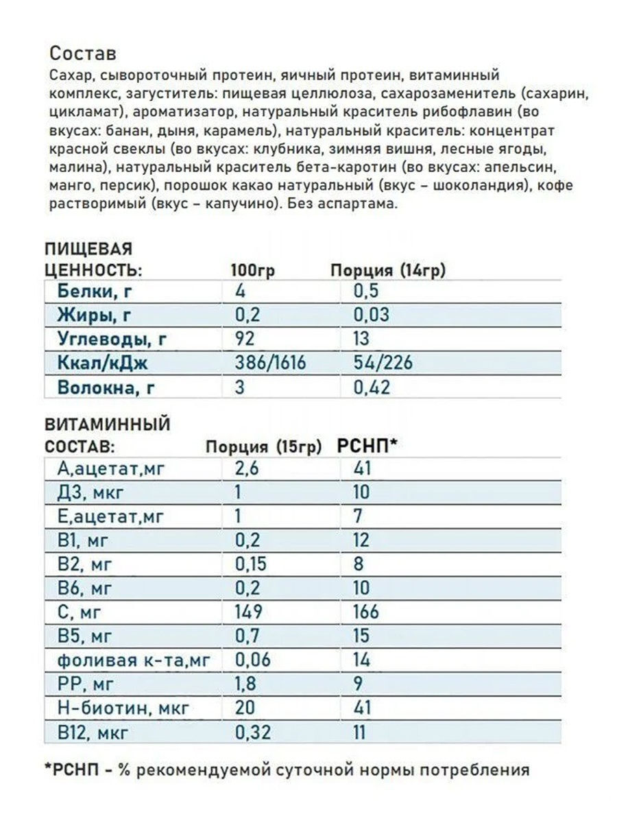 Состав:Сахарная пудра, сывороточный протеин, яичный протеин, витаминный комплекс, загуститель: пищевая целлюлоза, сахарозаменитель (сахарин, цикламат), ароматизатор, натуральный краситель рибофлавин (во вкусах: банан, дыня, карамель), натуральный красител