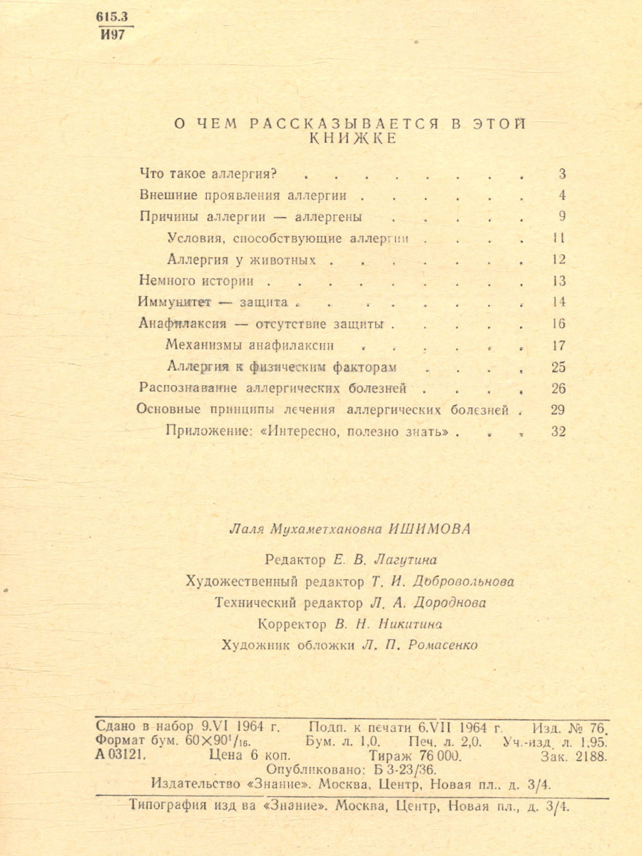 Из этой брошюры читатель узнает все об аллергии: ее историю; условия, способствующие аллергии; причины аллергии; внешние проявления; методы борьбы с нею и об аллергии у животных.