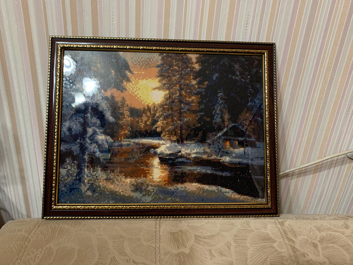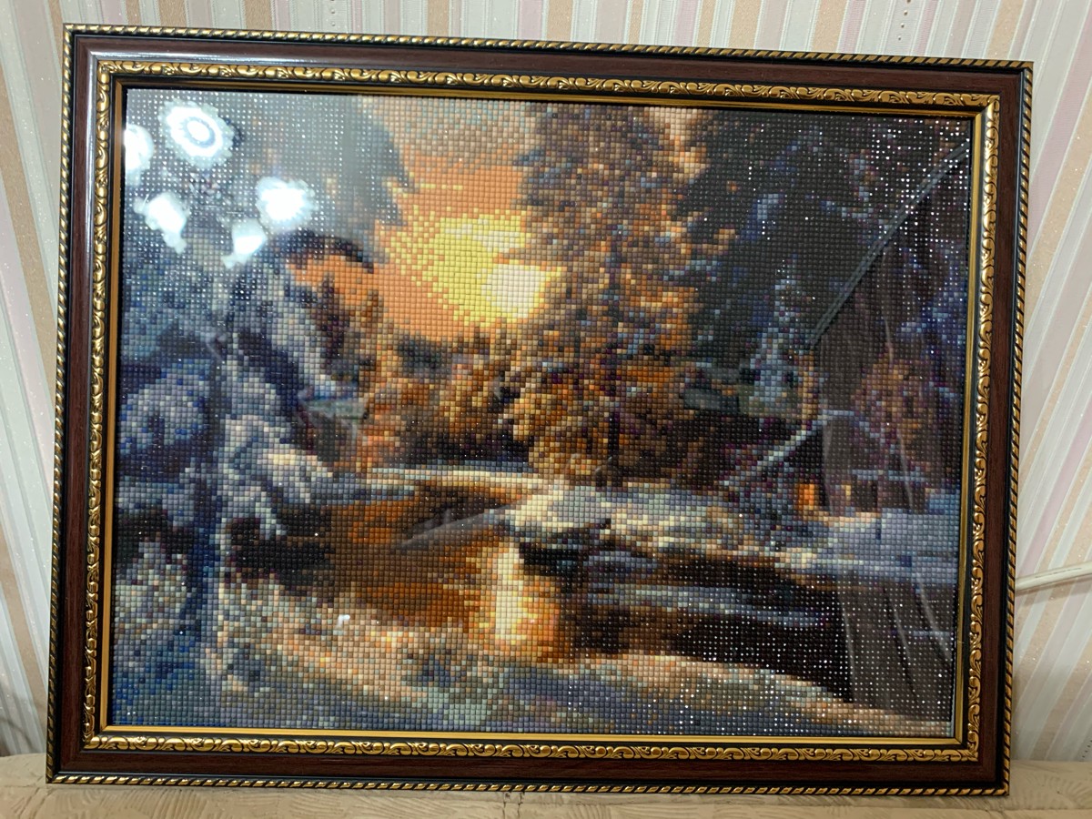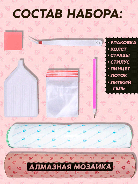 Алмазная мозаика - это набор инструментов для создания красивой картины. Алмазная вышивка имеет схему, по которой на холст накладываются стразы. В комплект входит:Холст с клеевым слоем и схемой картины, квадратные стразы, пинцет, лоток для страз, палочка-