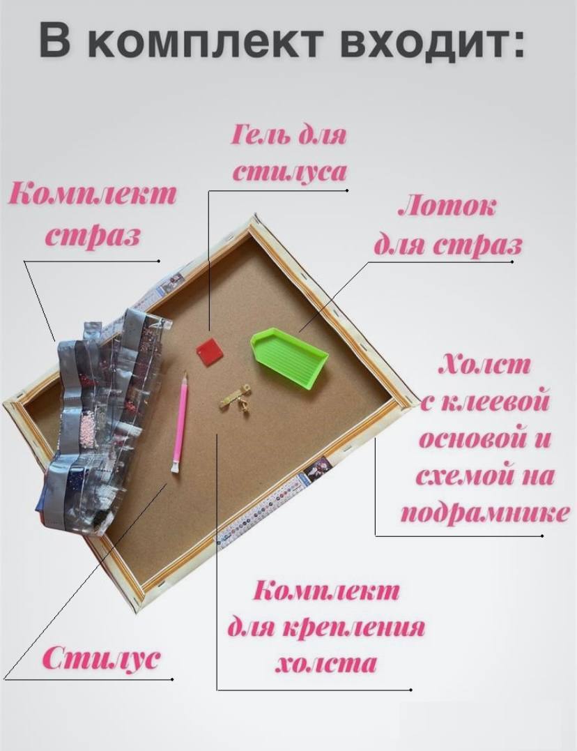 Алмазная мозайка на подрамнике полная выкладка В набор входит:1. Холст с нанесённым рисунком и клеевым слоем2.Круглые стразы 3.Стилус, емкость для страз4.Клей Набор упакован в красивую фирменную коробочкуКомплектация:Алмазная мозайка на подрамнике полная