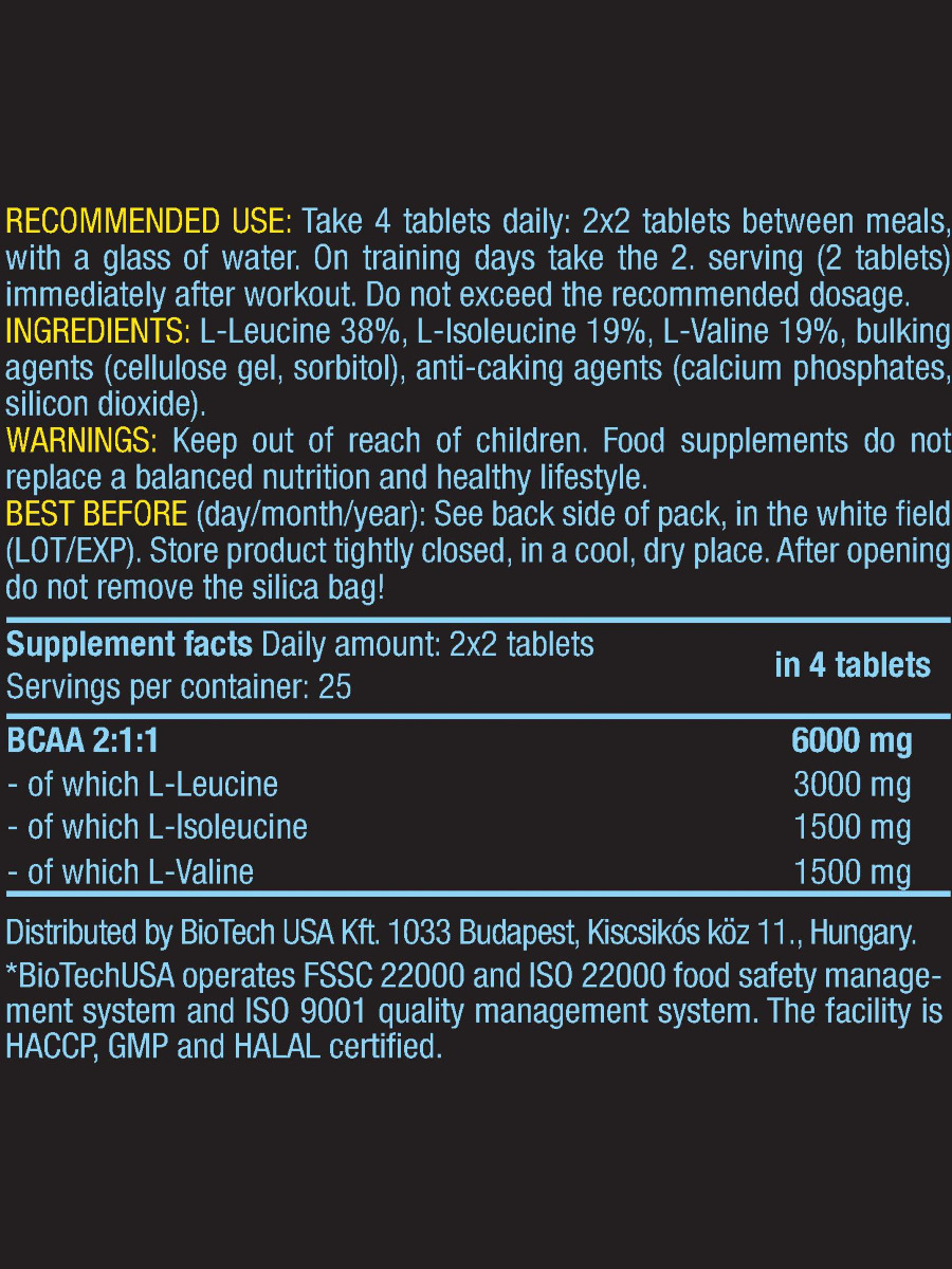 BCAA 6000 представляет собой аминокислотный продукт в форме таблеток с самой высокой концентрацией активных ингредиентов, производимых BioTech USA. Аминокислоты, являясь строительными блоками белков, способствуют росту и поддержанию мышечной массы. Таблет