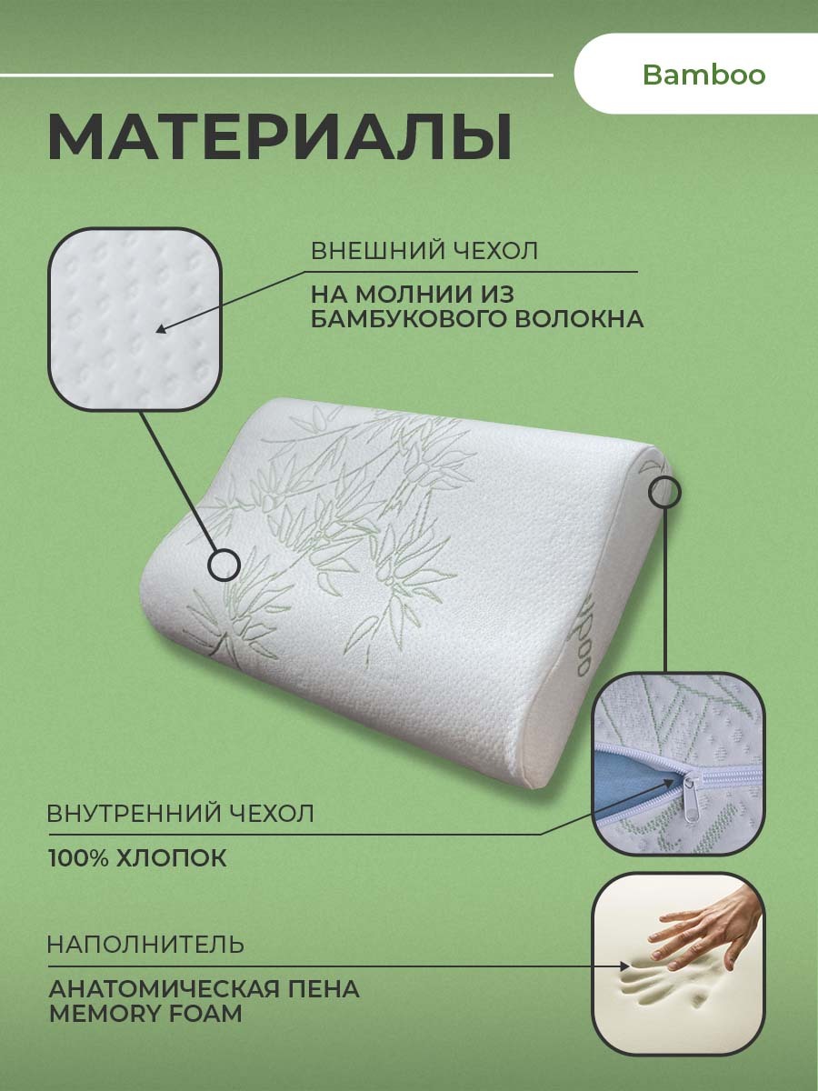 Материал наполнителяПенополиуретан, Memory Foam, Анатомическая пена, Вязкоэластичная пена, Хлопковое волокно, Хлопок, Бамбуковое волокно, Бамбук