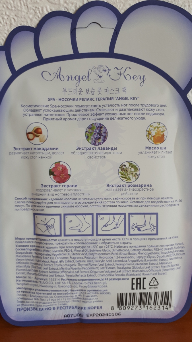 Способ примененияОткройте упаковку, разрежьте по линии обреза. На чистые и сухие ноги наденьте носочки, зафиксируйте их наклейками. Слегка помассируйте ступни и оставьте на 15-20 минут. Снимите носочки, остатки эссенции распределите по коже ног. Меры предосторожности: не