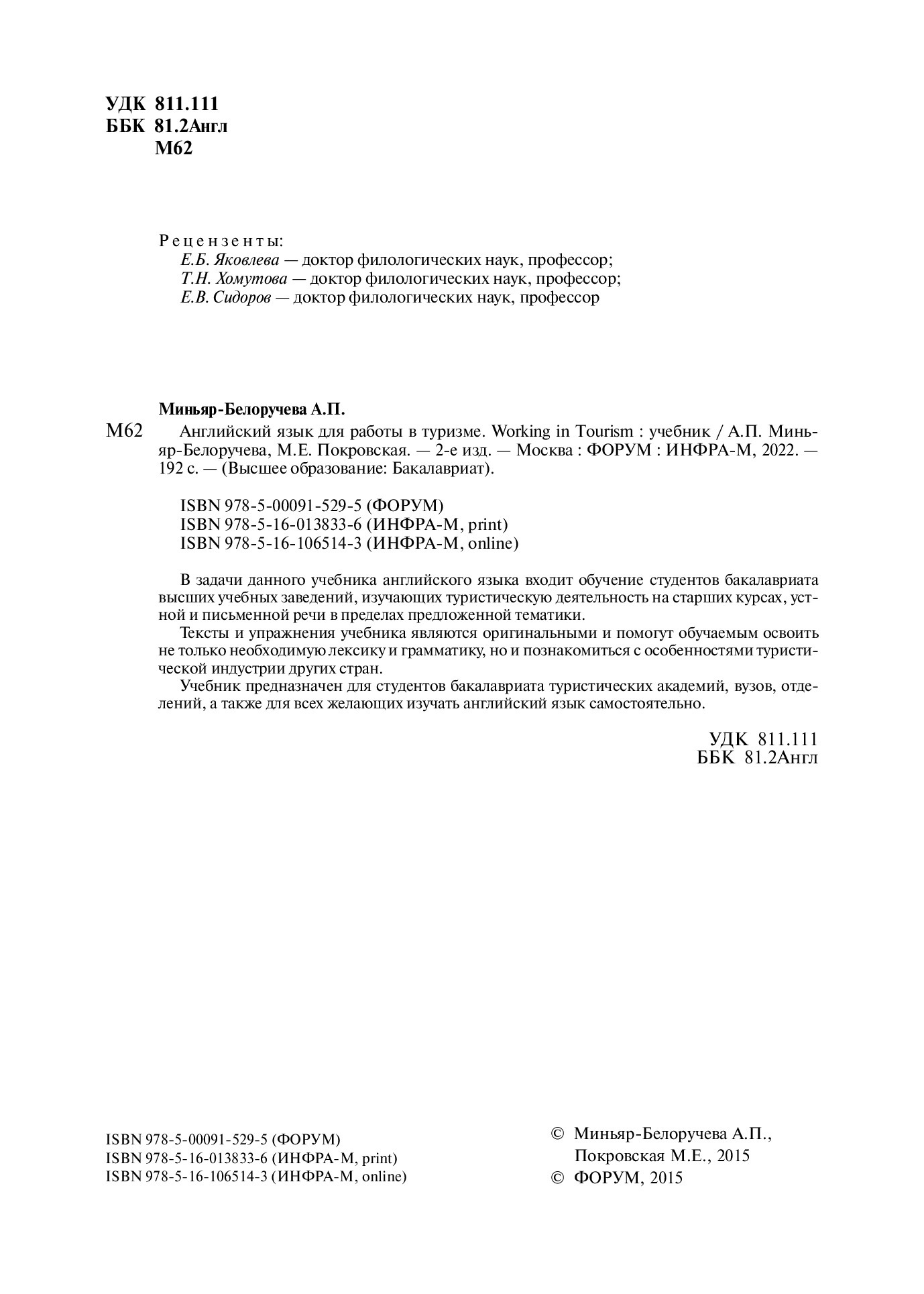 Издание 2-е. В задачи данного учебника английского языка входит обучение студентов бакалавриата высших учебных заведений, изучающих туристическую деятельность на старших курсах, устной и письменной речи в пределах предложенной тематики.Тексты и упражнения