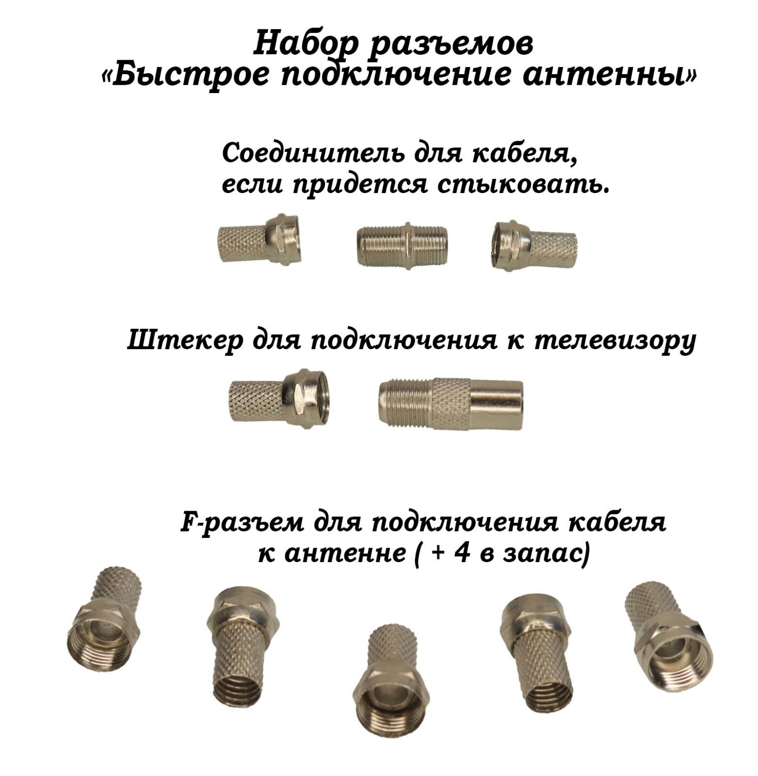 Коаксиальный телевизионный антенный RG-6U - 15 метров (75 Ом) + Набор антенных разъемов "Быстрое подключение антенны" : F-разъем - 7 штук, соединитель для кабеля - 1 штука, штекер ТВ (на F-разъем) - 1 штука