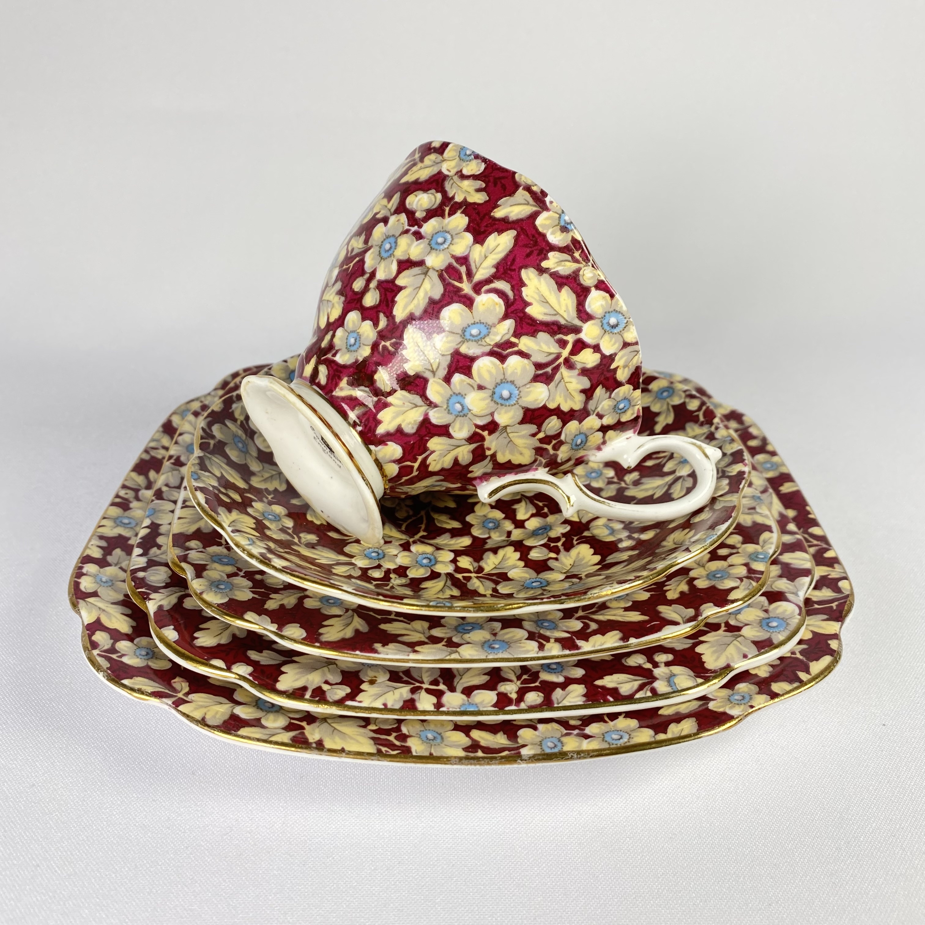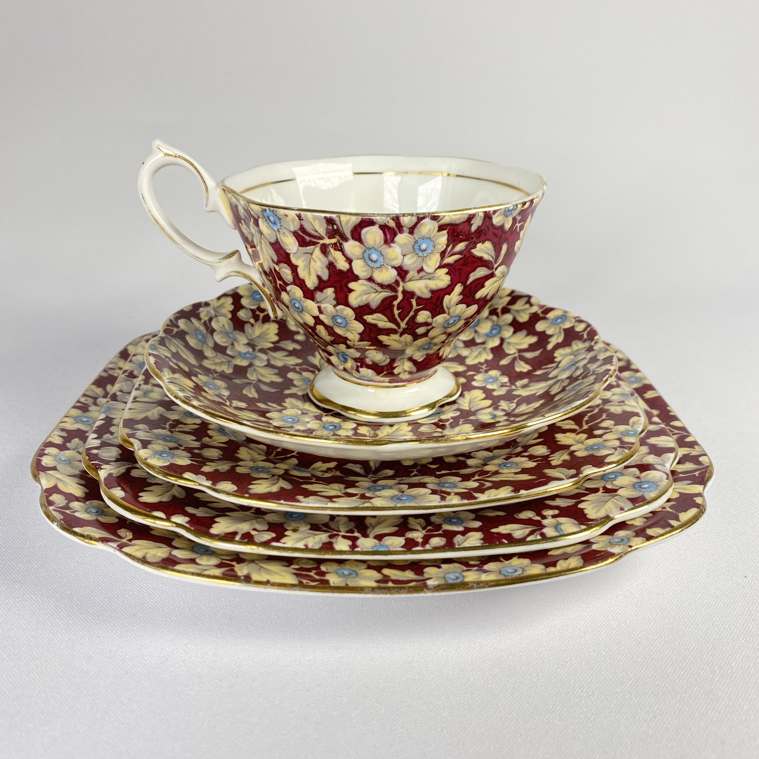 Комплектация:Чашка: диаметр 9 см., высота 6,5 см.Блюдце: 14,2 см.Тарелка: 15,3 смТарелка: 17 см.Тарелка: 19,5 см.Описание:Совершенно роскошный антикварный сет от одного из лучших английских производителей элитного костяного фарфора Royal Albert. Серия "Ro