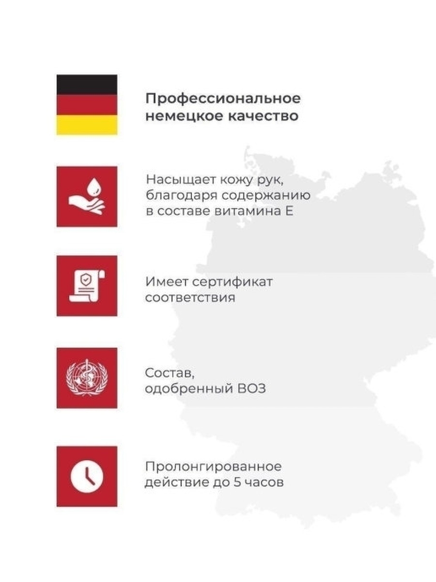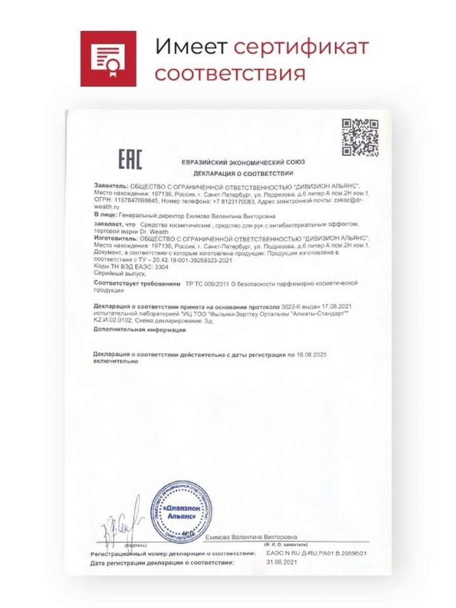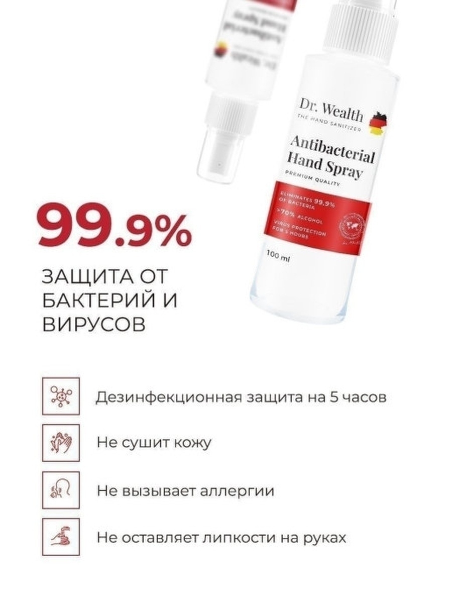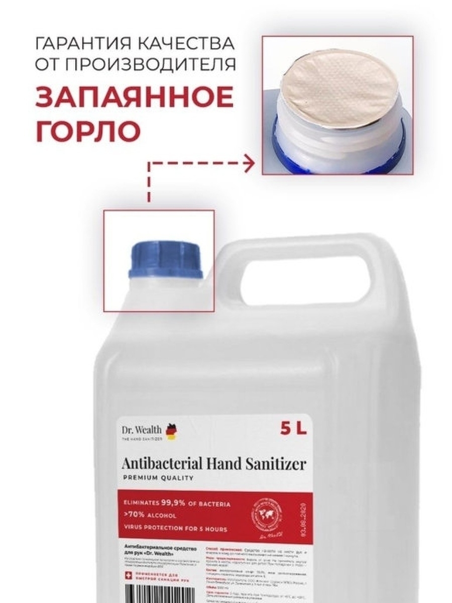 Антисептик для рук (жидкость) Dr. Wealth изготовлен по немецкой технологии в соответствии со стандартами Института стандартизации Германии, а также по рекомендации ВОЗ! Объём 5 литров (5000 мл.)Санитайзер / антисептик имеет выраженный кратковременный запа