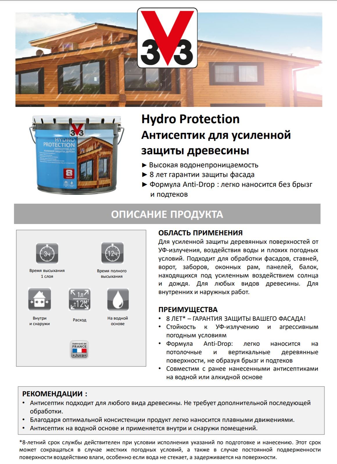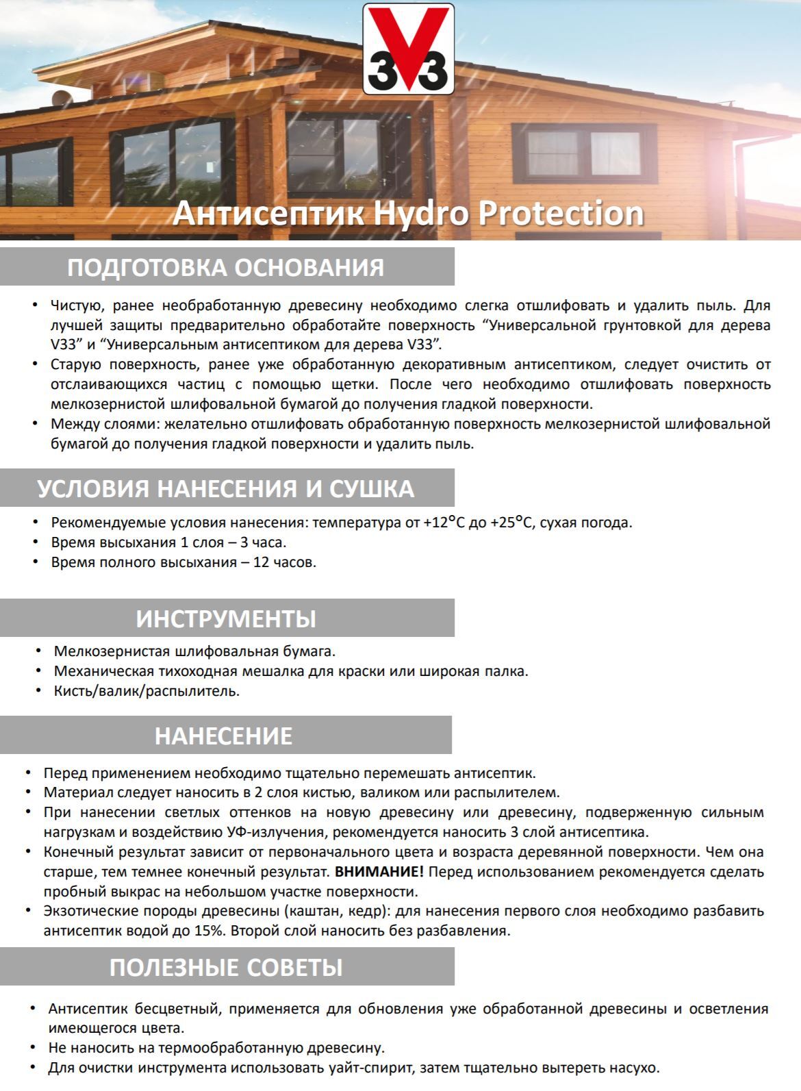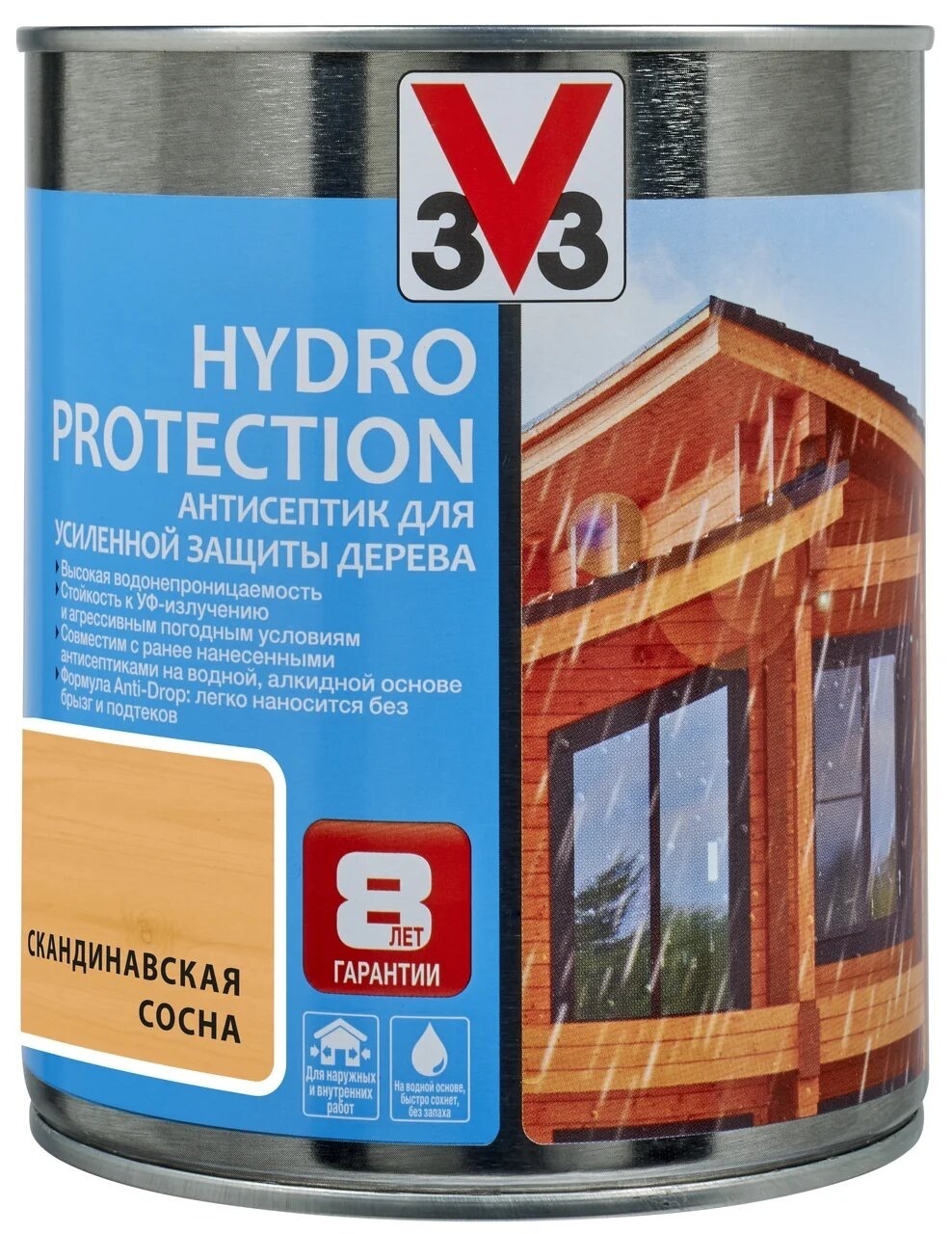 Антисептик Hydro Protection обеспечивает высокую устойчивость к воздействию УФ-излучения и плохим погодным условиям. Благодаря Anti-Drop формуле, легко наносится на вертикальные и потолочные деревянные поверхности, не образует подтеков. Подходит для обраб
