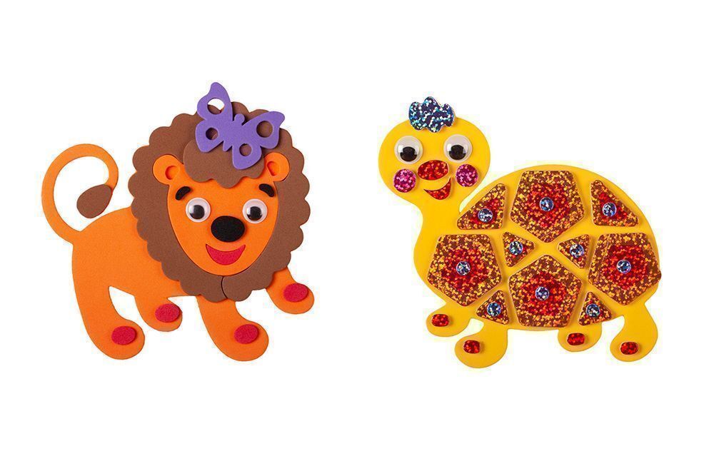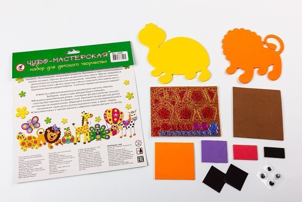 Комплектация:В наборе:— 2 основы из ЭВА, вырубленные по форме животного,— детали из ЭВА двух фактур (матовые, голографические) на самоклеящейся основе (6 цветов), — декоративные элементы на самоклеящейся основе (глазки),— цветная листовка-образец.